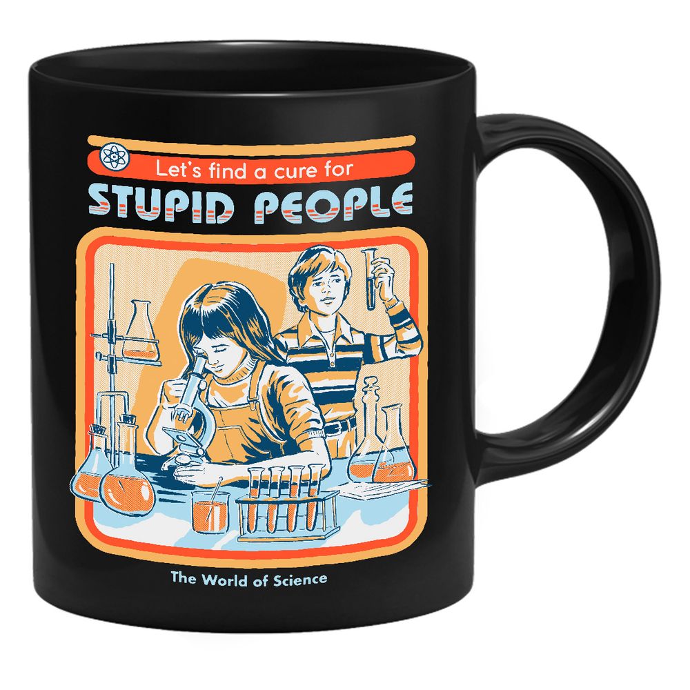 The mug shows a boy and a girl working with test tubes and a microscope. On top of it is the text "Let's Find A Cure For Stupid People".