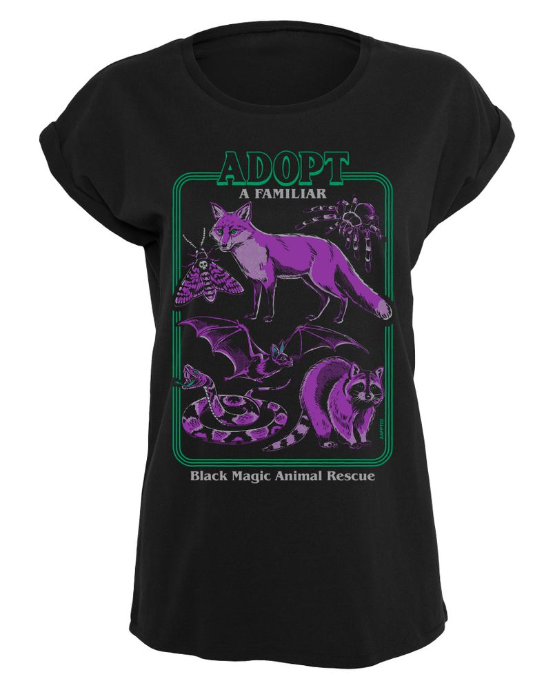 The t-shirt shows different animals waiting for adoption. Underneath is the saying "Black Magic Animal Rescue".
