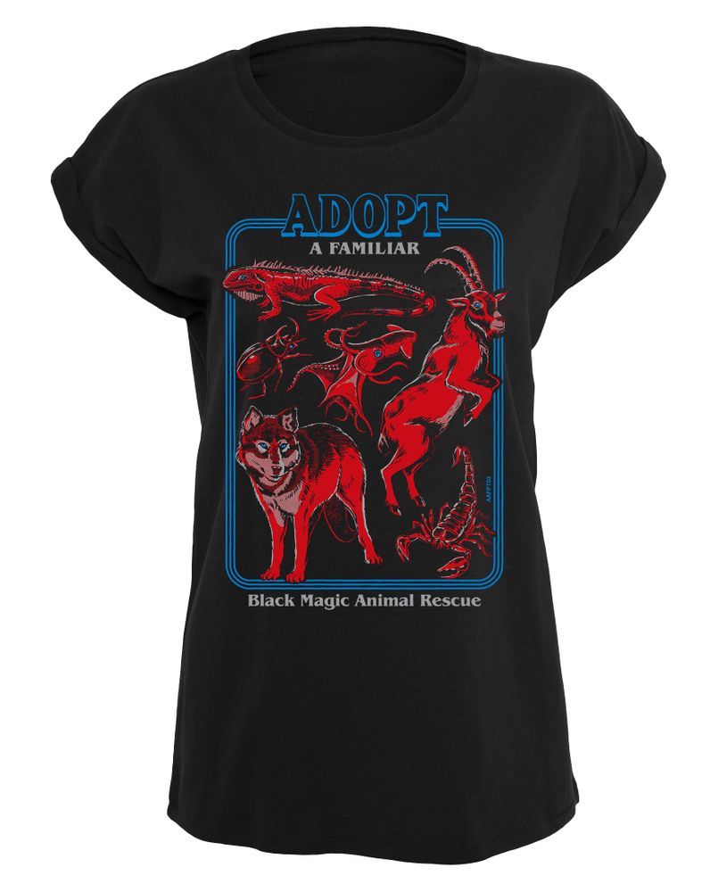 The t-shirt shows different animals waiting for adoption. Underneath is the saying "Black Magic Animal Rescue".