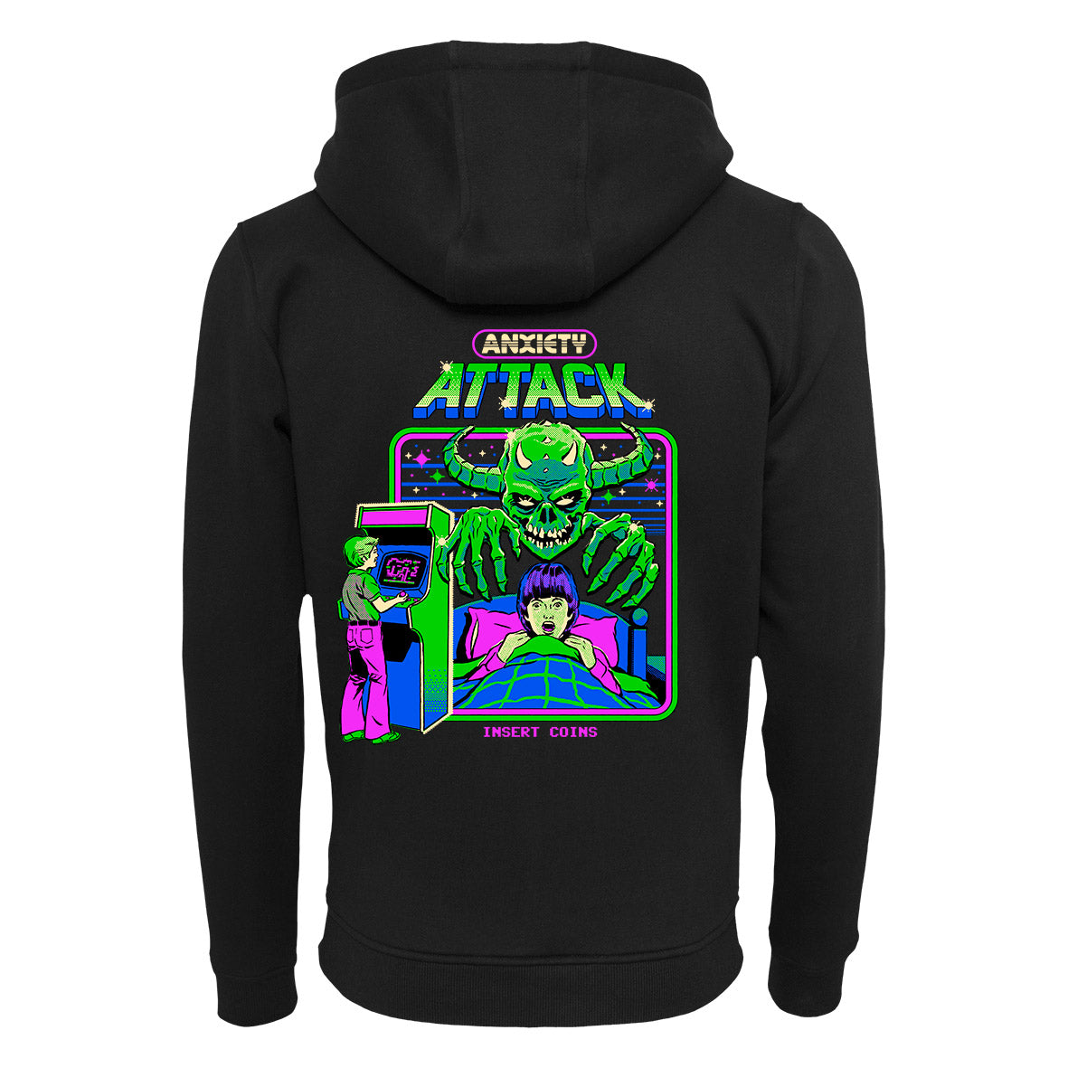 The hoodie shows a monster scaring a child. However, this is part of a video game.