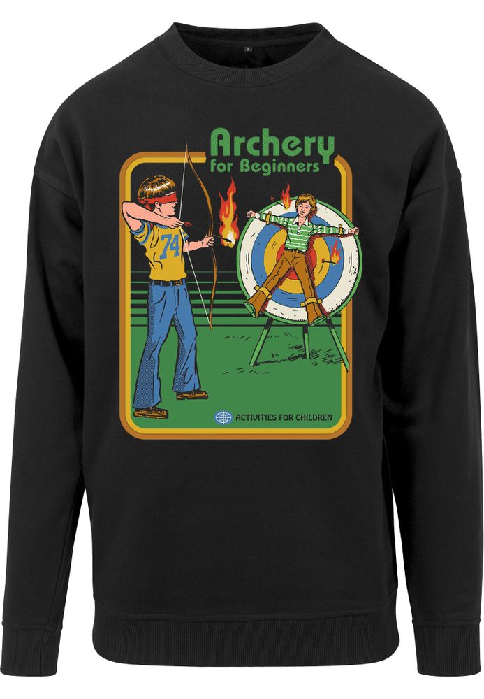 The sweater shows a boy shooting blindfolded and with a flaming arrow at a target where another boy is tied up. You can also read the text "Archery For Beginners".