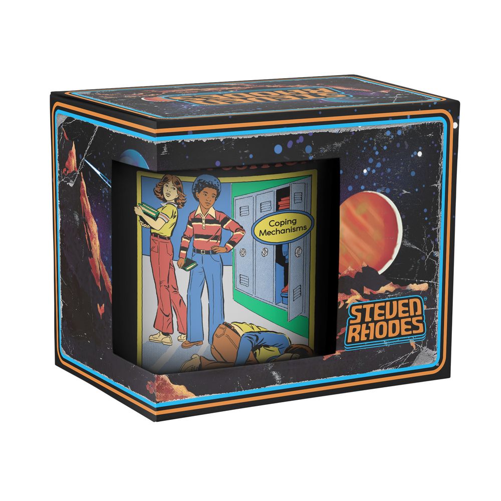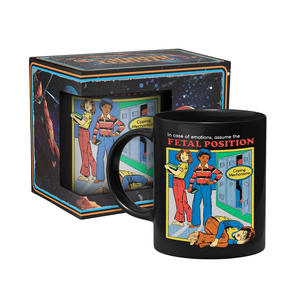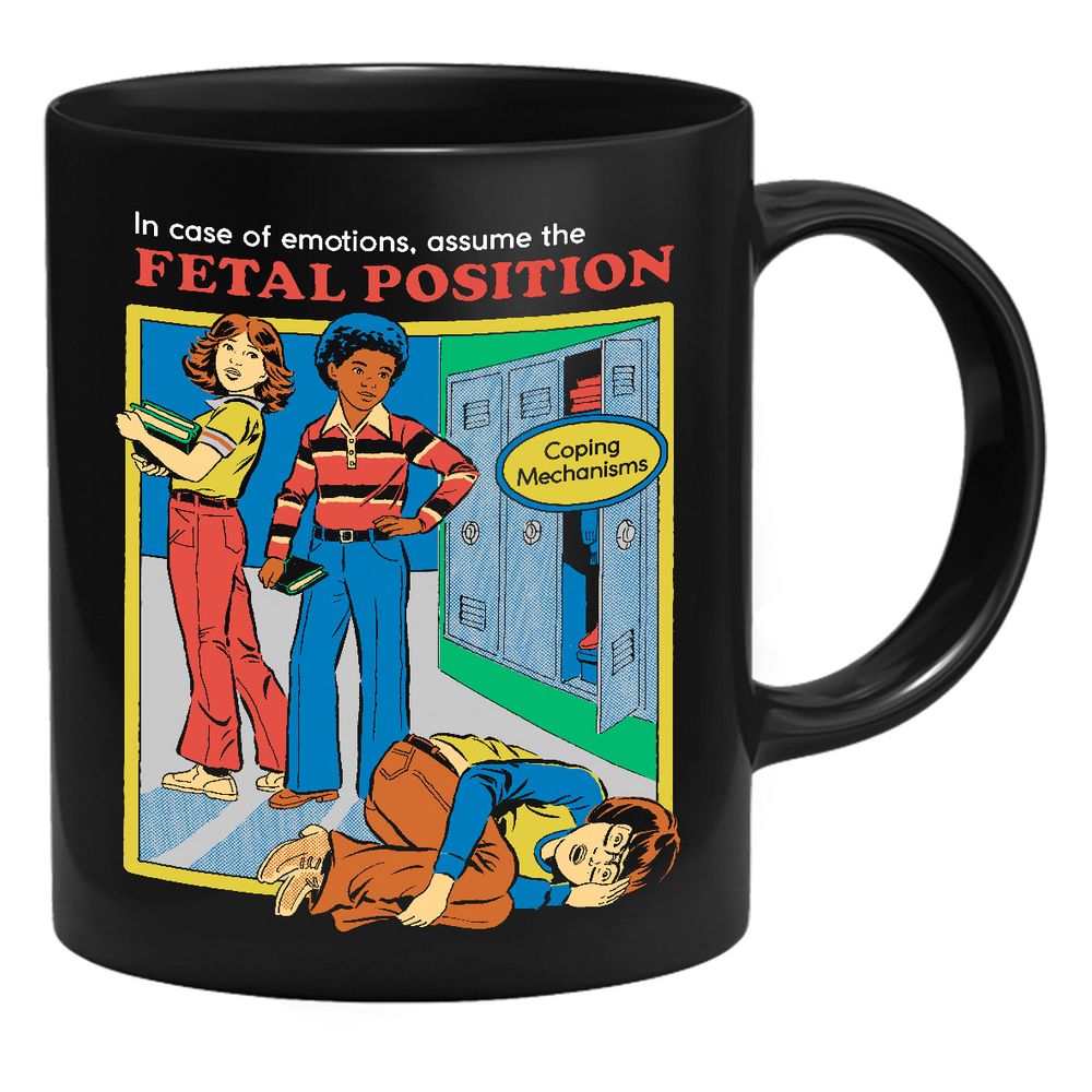 The Mug shows two children watching a girl lying on the floor in foetal position. At the top it says "In case of emotions, assume the Fetal Position".