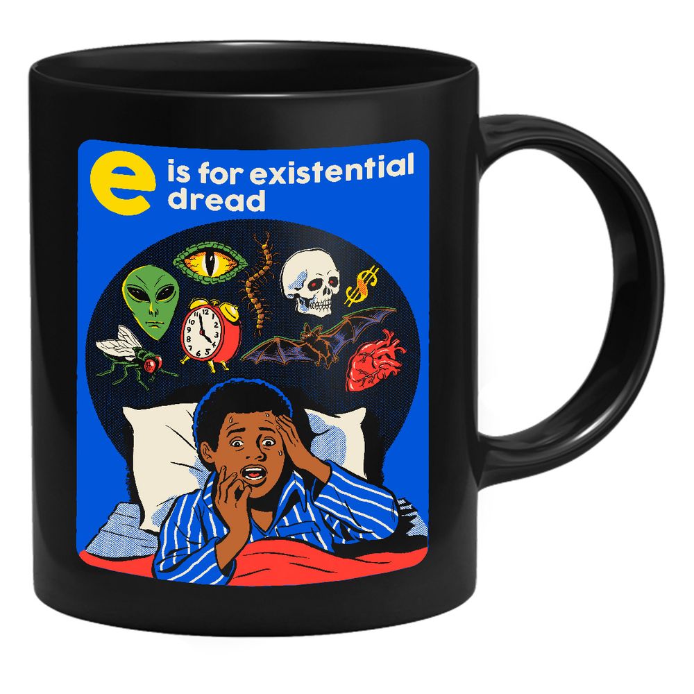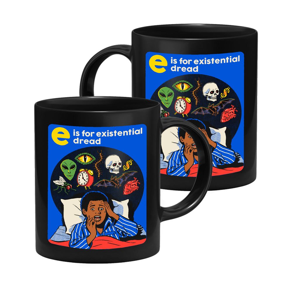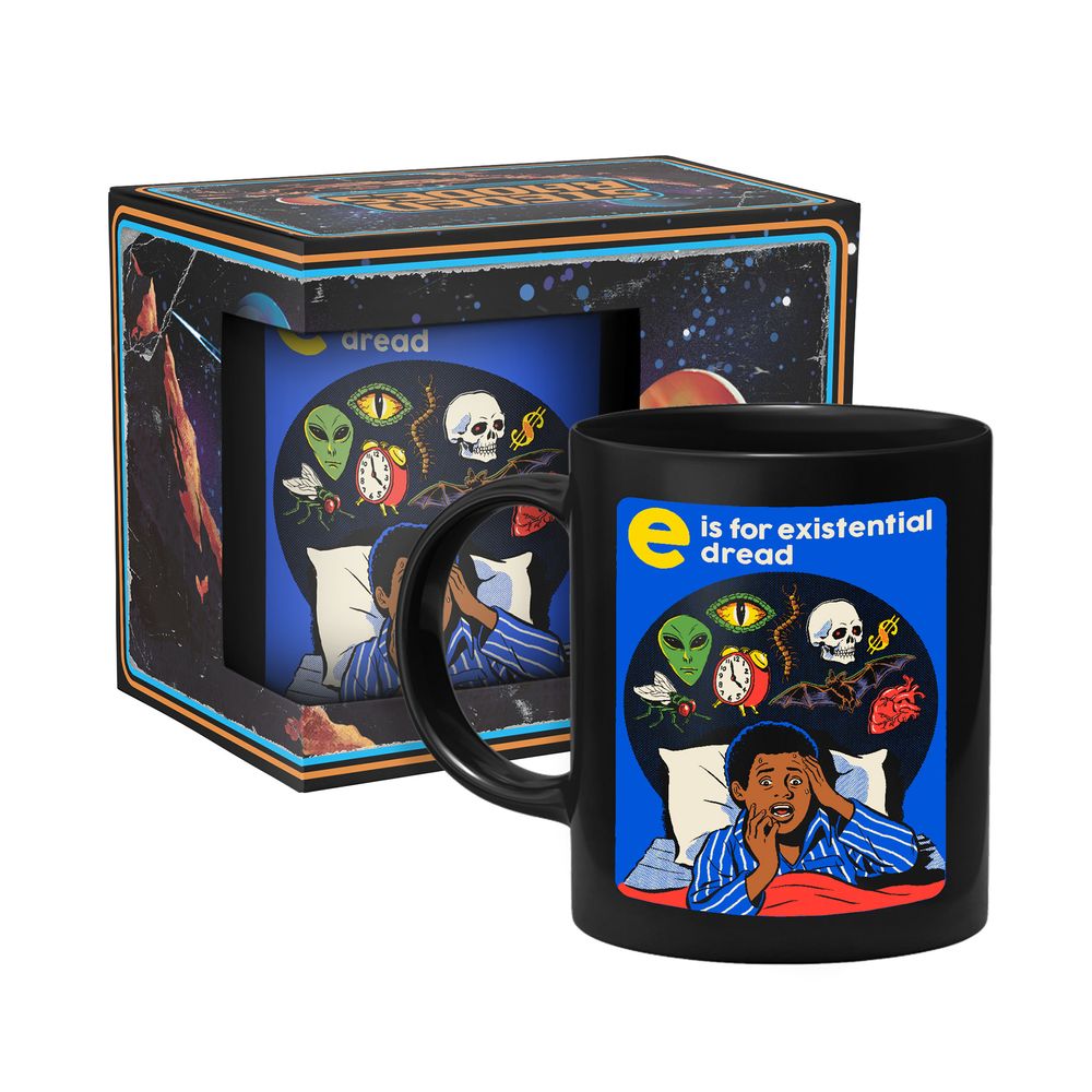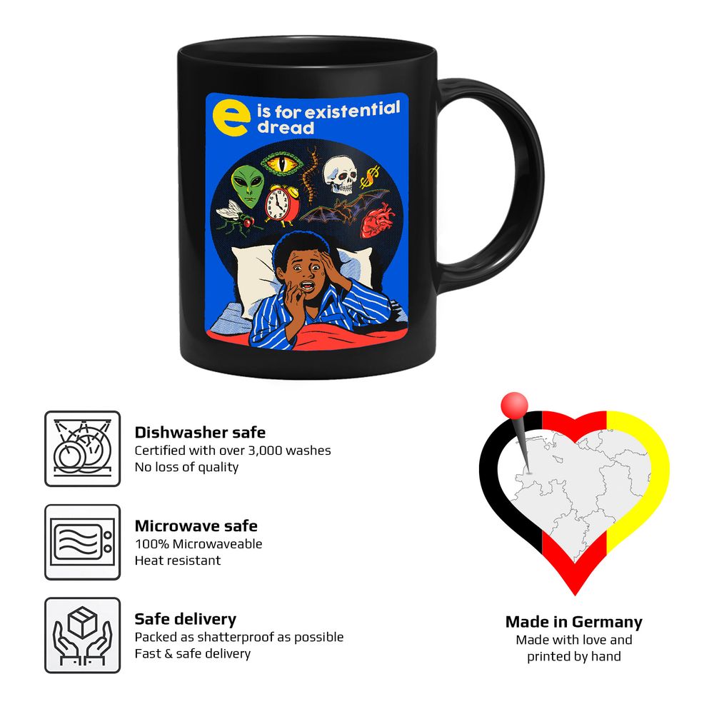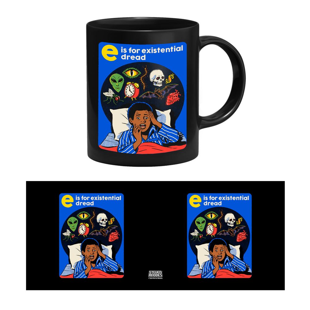 The mug shows a boy who is scared and has woken up from a nightmare.