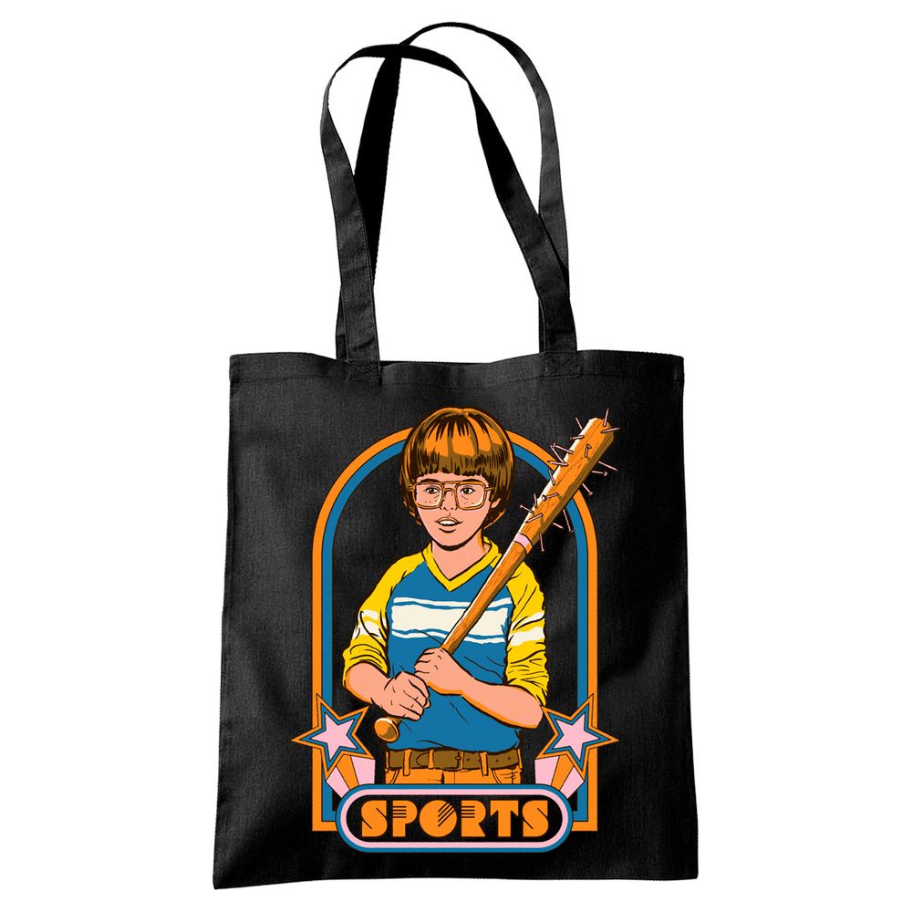 The bag shows a boy with a baseball bat peppered with nails.