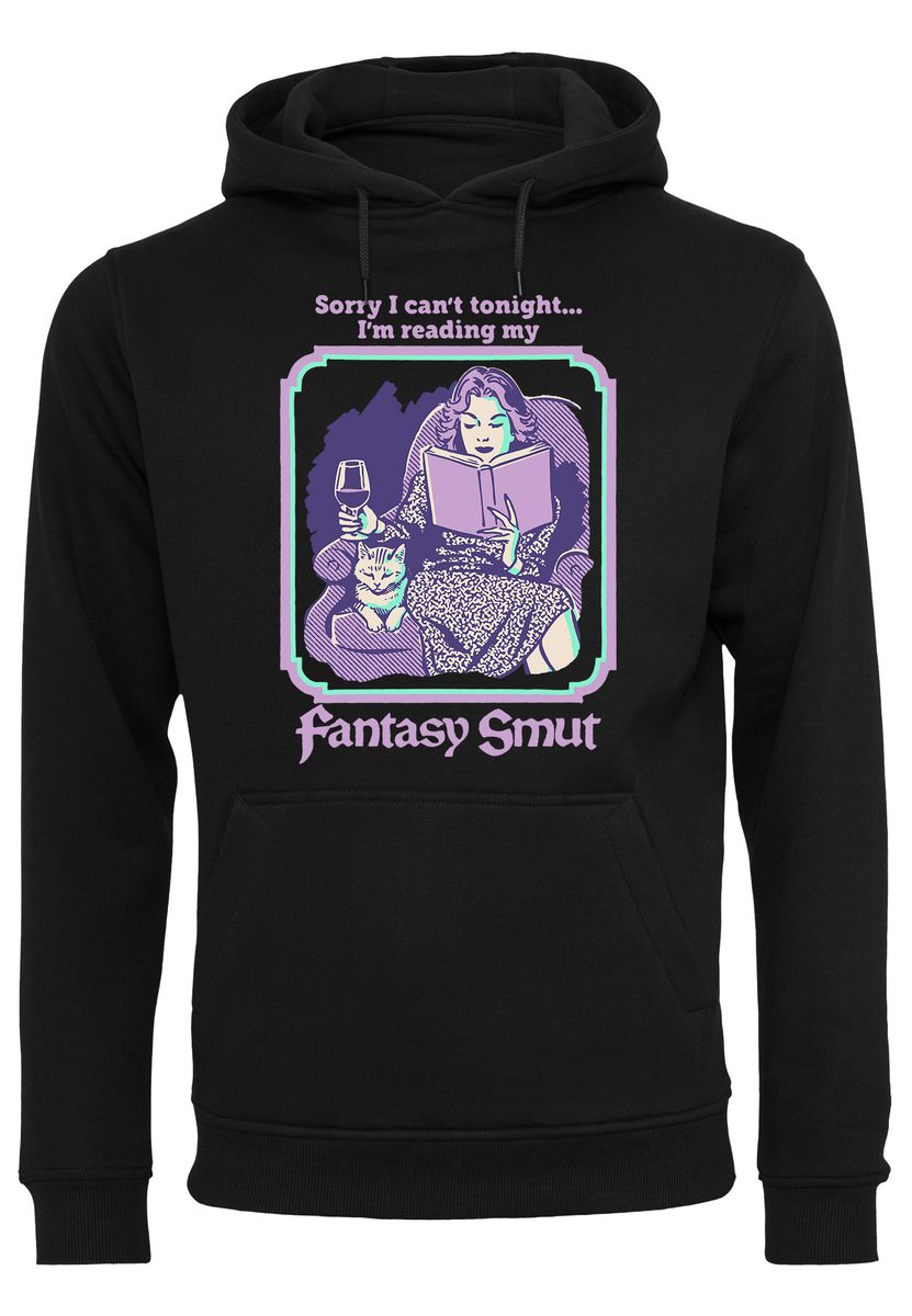 The hoodie features a woman sitting on an armchair with her cat, reading a book.