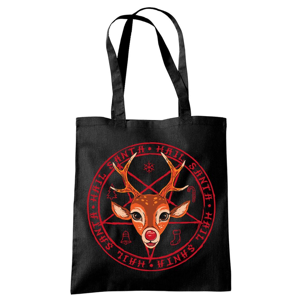 The bag shows a reindeer head on a pentagram. Around it is written "Hail Santa" in a circle.