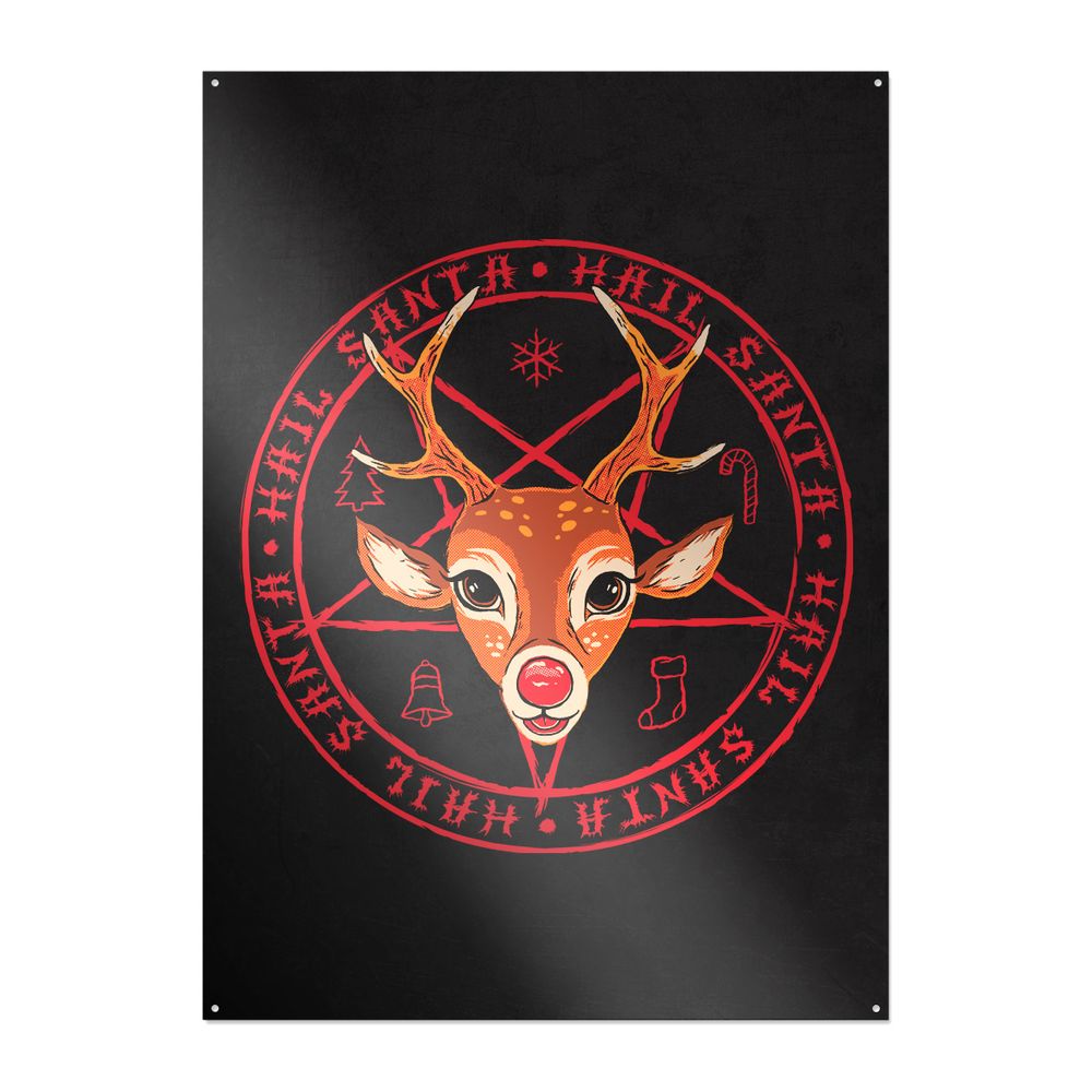 The metal sign shows a reindeer head on a pentagram. Around it is written "Hail Santa" in a circle.