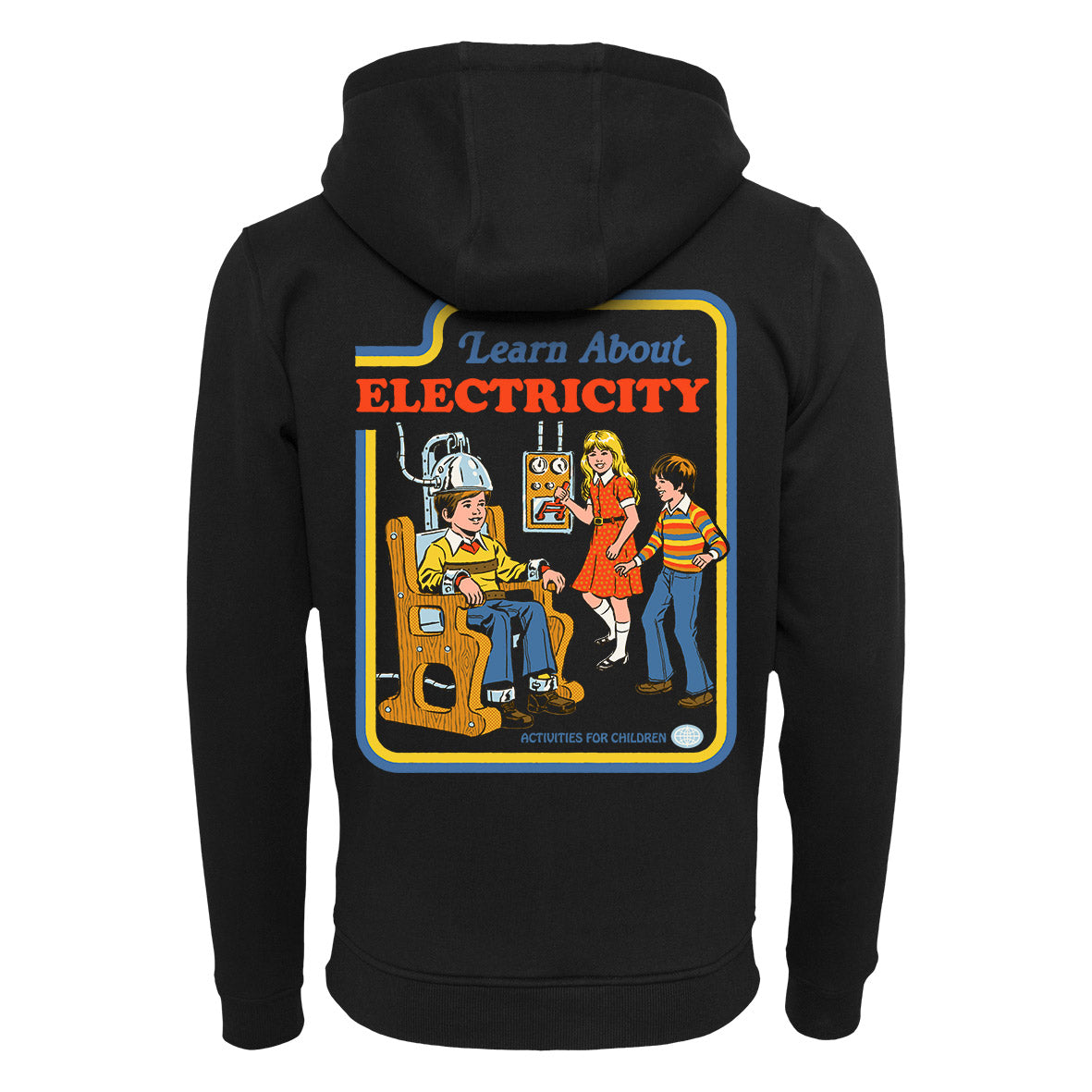 The hoodie shows a boy sitting in an electric chair. Two other children are operating a lever.