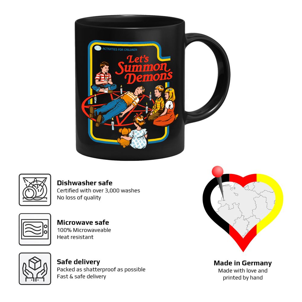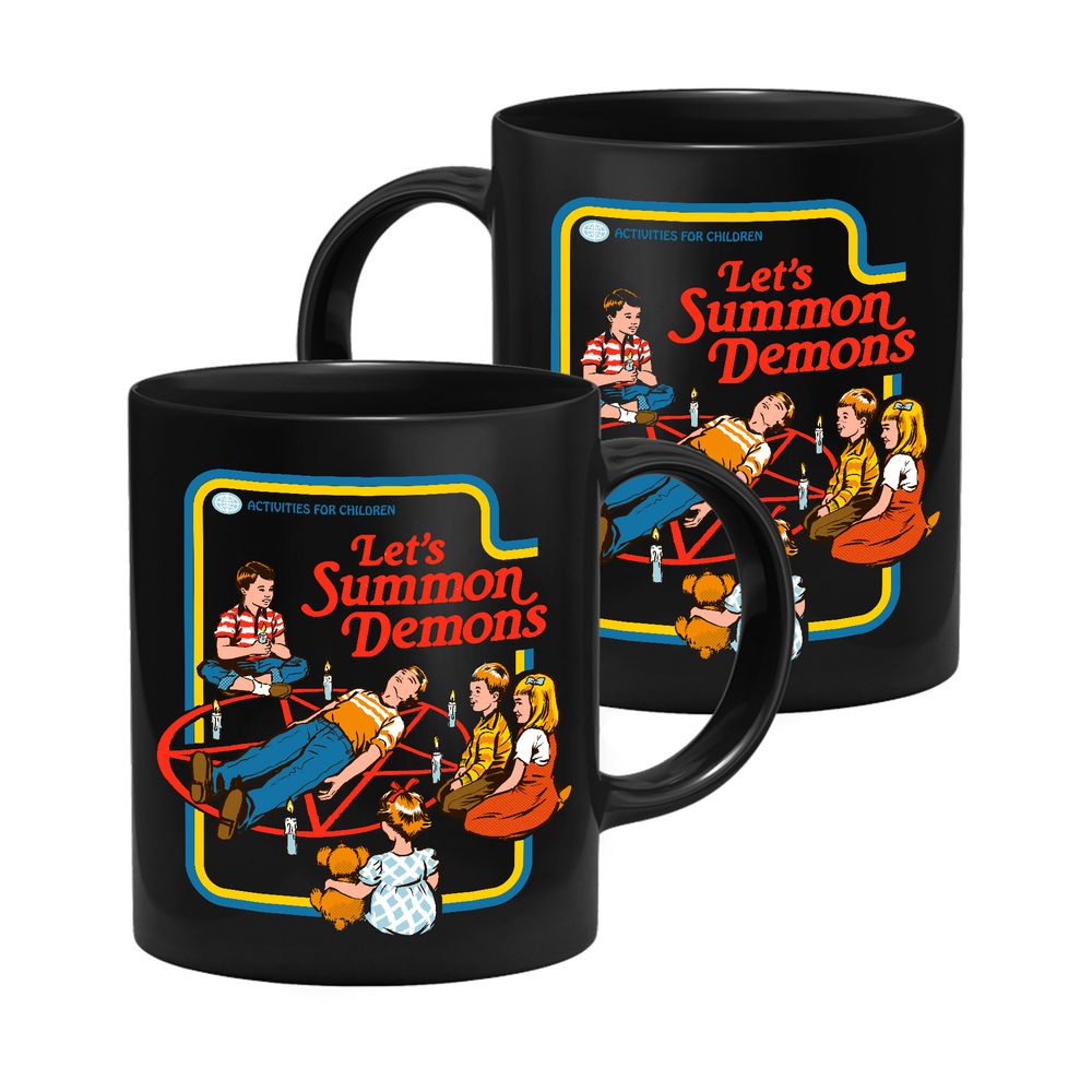 The mug shows children who want to summon a demon with the help of a pentagram and the text "Let's Summon Demons".