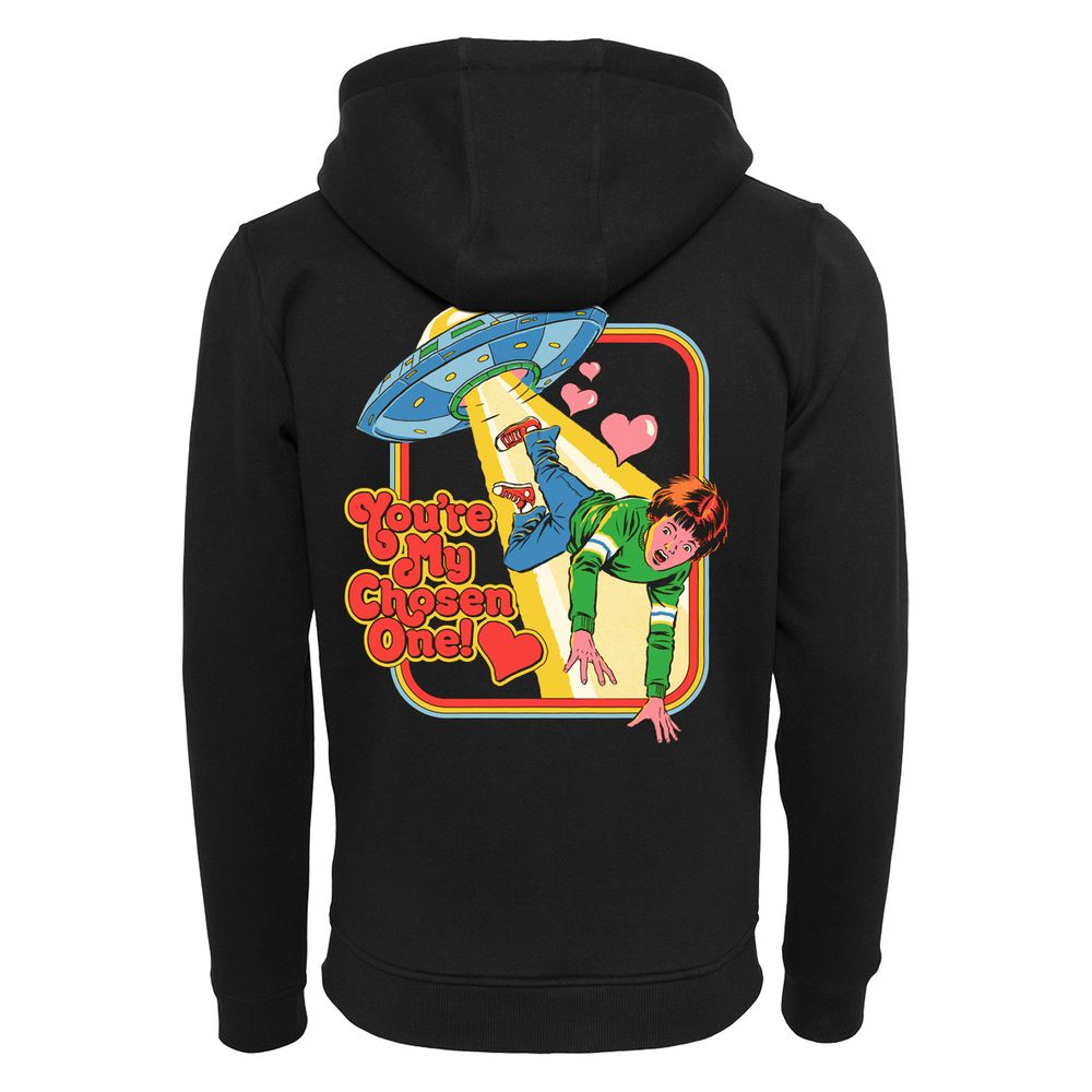 The zip hoodie shows a boy being pulled in by an UFO. It also features hearts and the phrase "You're My Chosen One!".