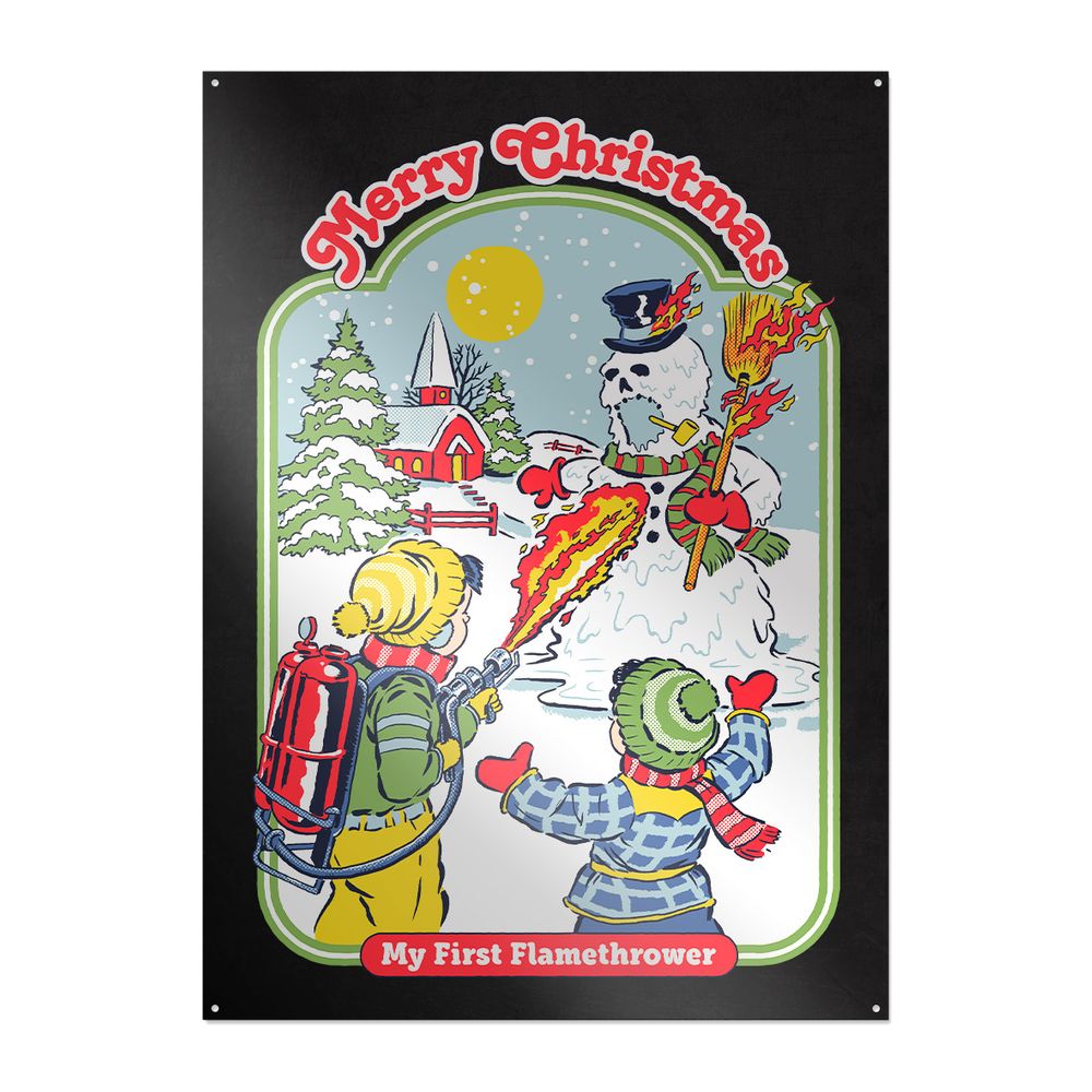 The metal plate shows two children burning down a snowman with a flamethrower. You can read the texts "Merry Christmas" and "My First Flamethrower".