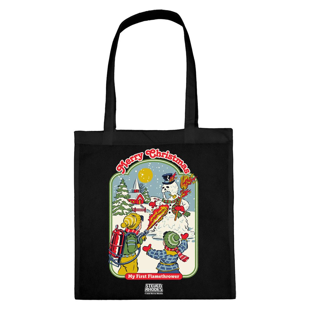 The bag shows two children burning down a snowman with a flamethrower. You can read the texts "Merry Christmas" and "My First Flamethrower".