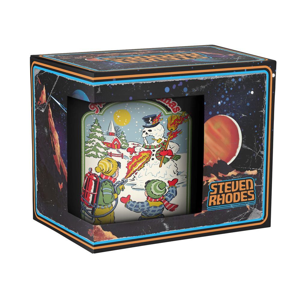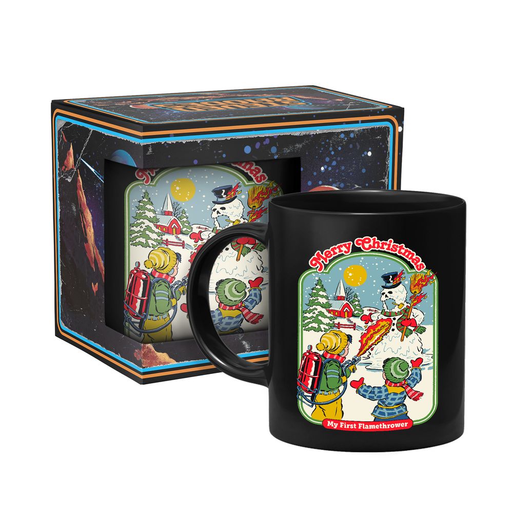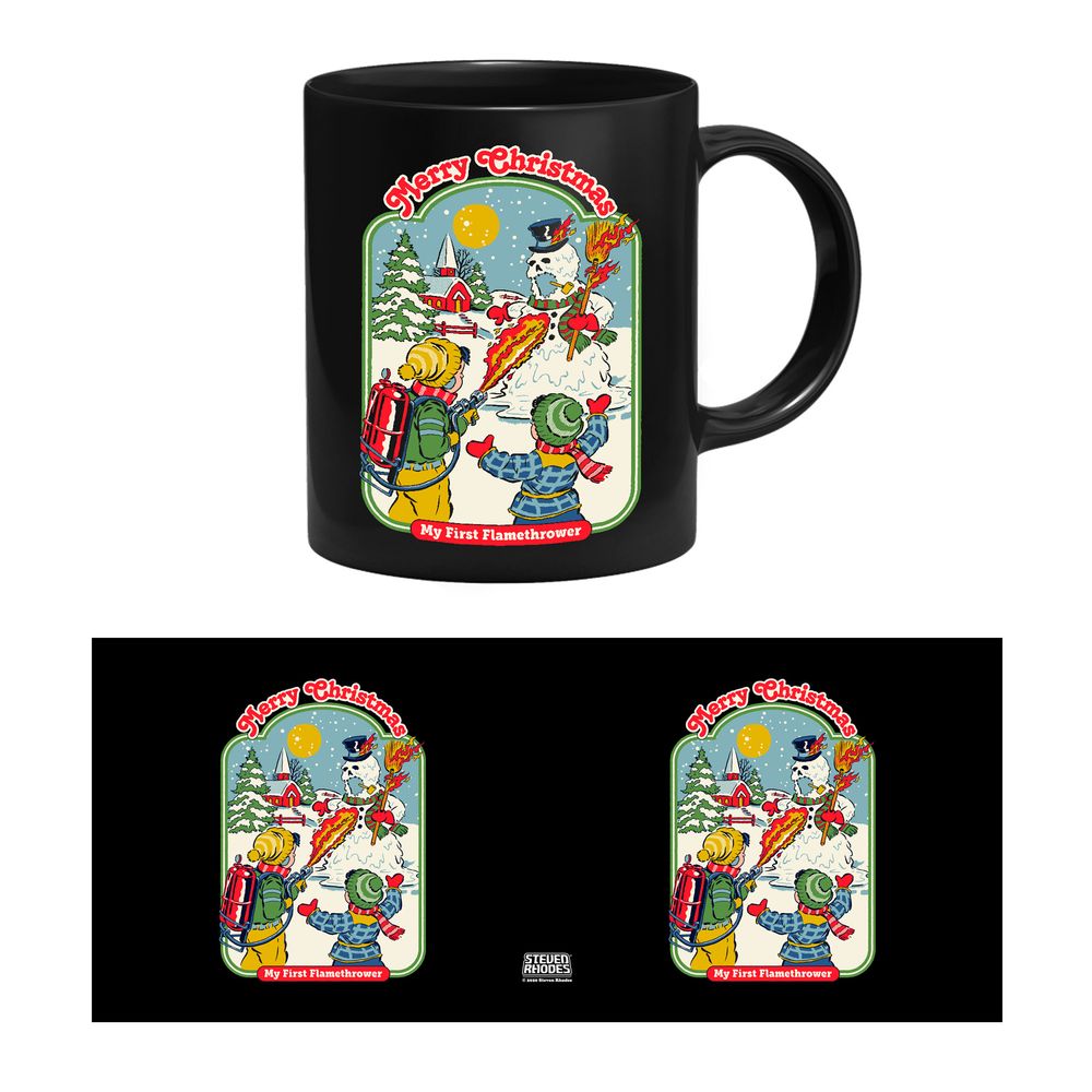 The mug shows two children burning down a snowman with a flamethrower. You can read the texts "Merry Christmas" and "My First Flamethrower".