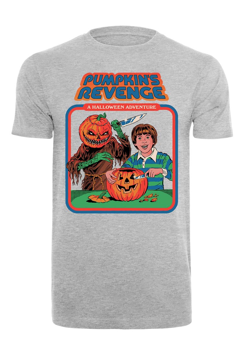 The T-shirt shows a boy carving a pumpkin. Next to him you can see a pumpkin with a knife in his hand. You can read the text "Pumpkin's Revenge".