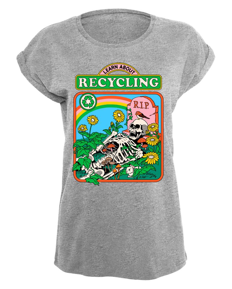 The t-shirt shows a skeleton on a flower meadow. Above it is written "Learn About Recycling."