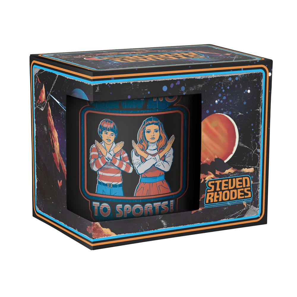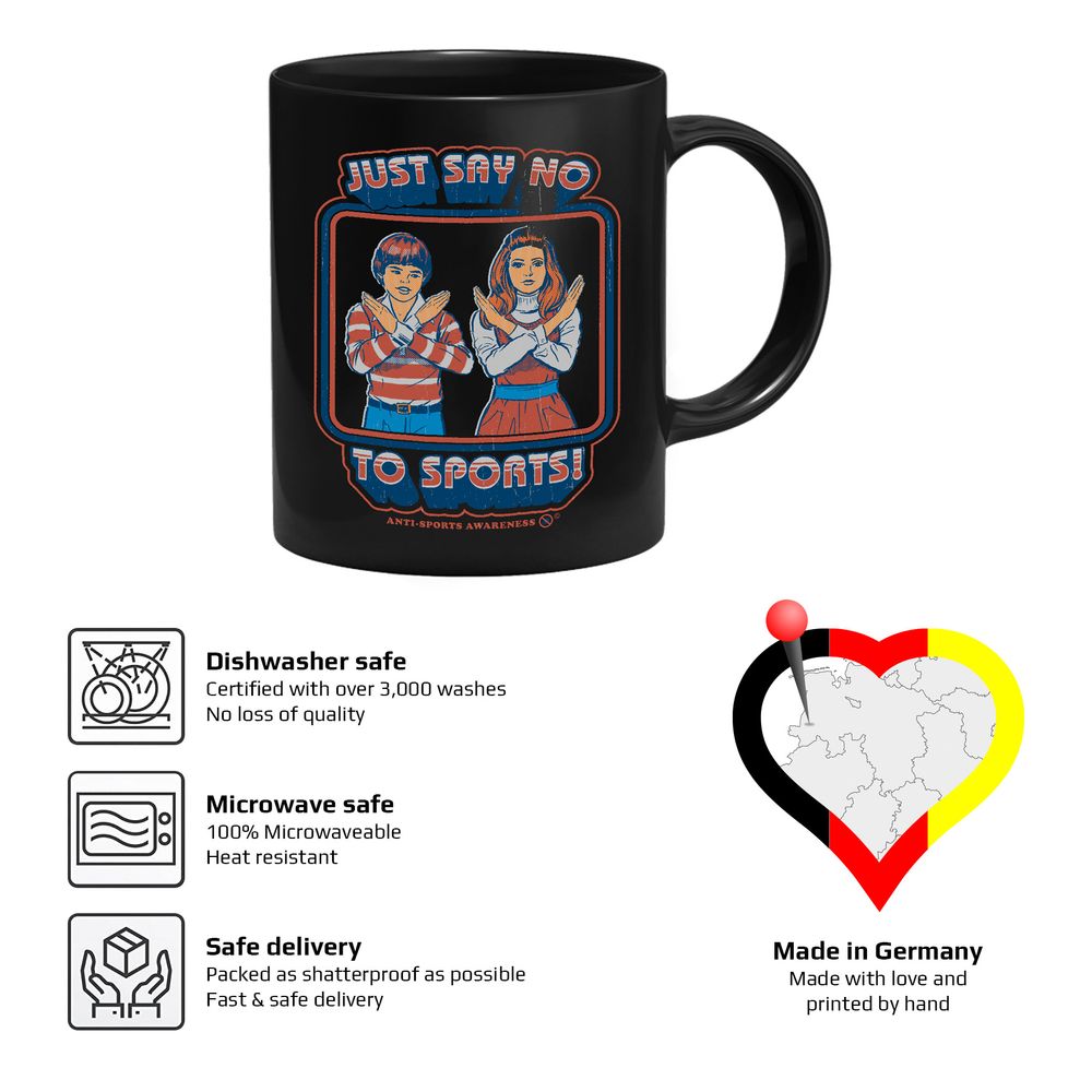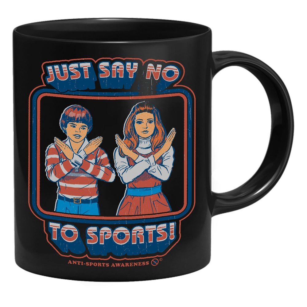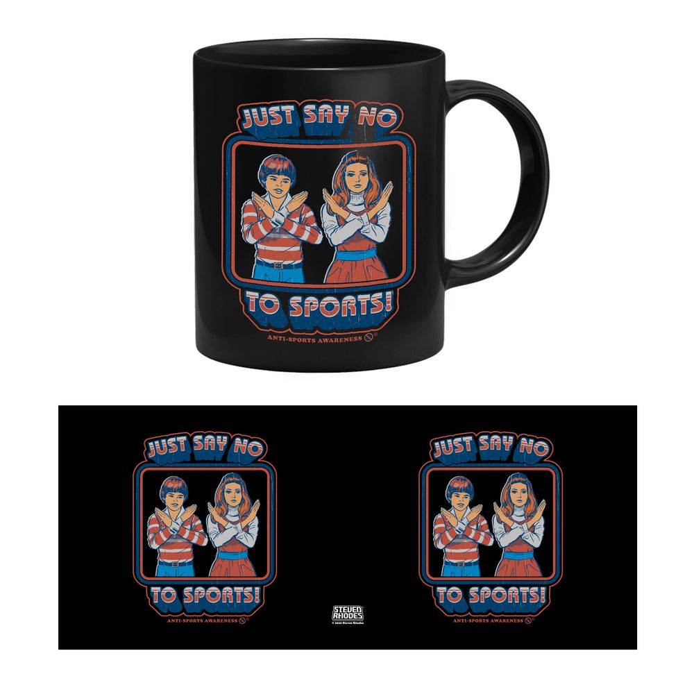 The mug shows a boy and a girl signalling that they don't feel like doing sports. You can read the the text "Just Say No To Sports".