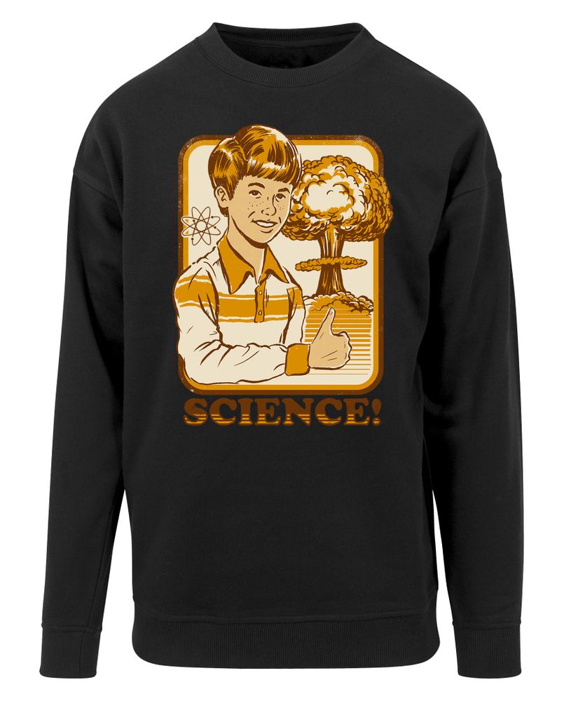 The sweater features a boy in front of a mushroom cloud and the word "Science!".