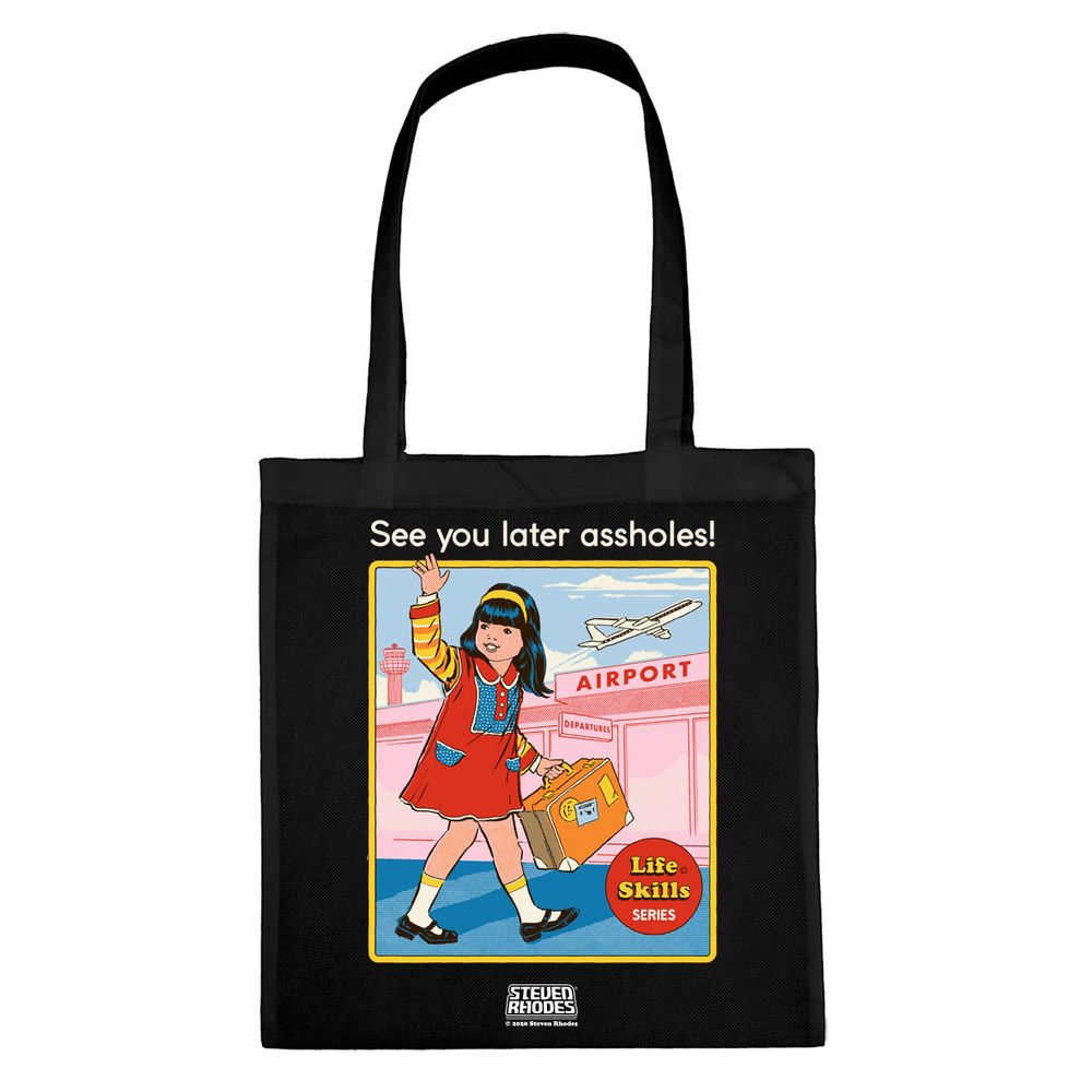 The bag shows a girl saying goodbye at the airport. At the top you can read the text "See you later assholes!".
