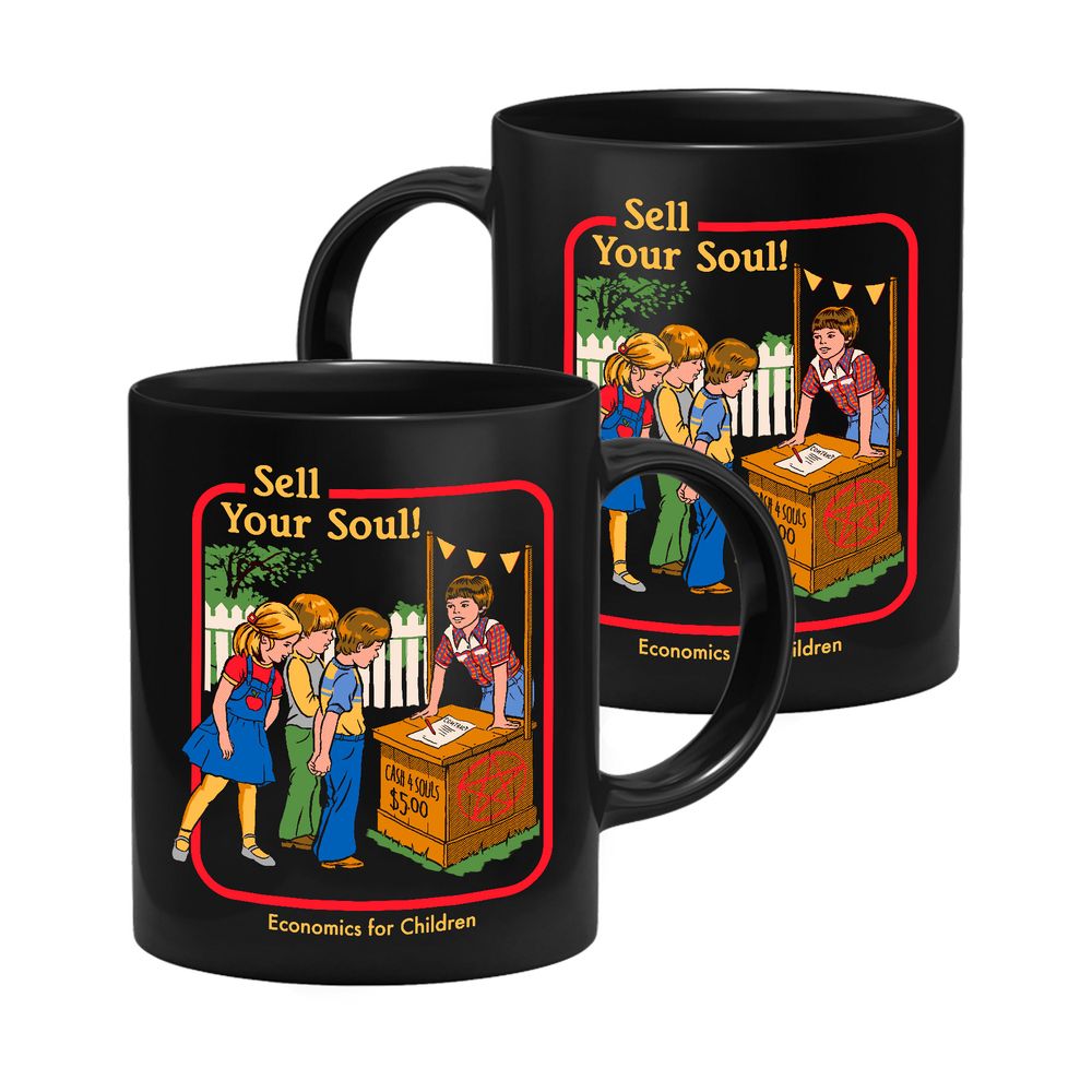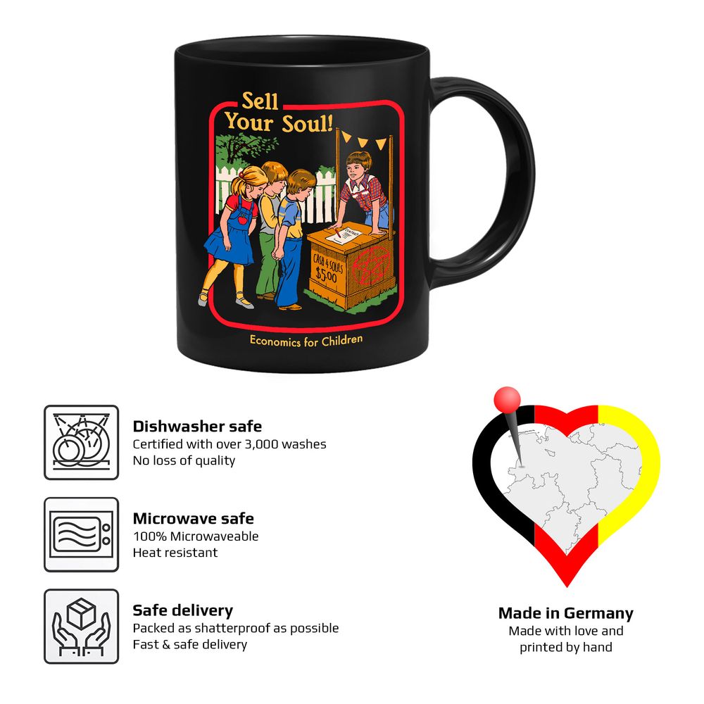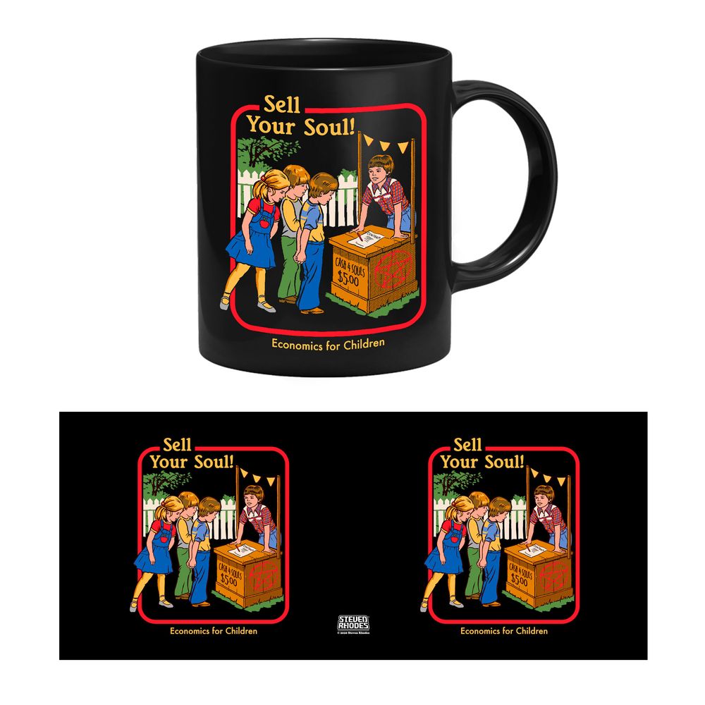 The cup shows three children who want to sell their soul for 5 dollars at a stand. Under the picture is written "Economics for Children".