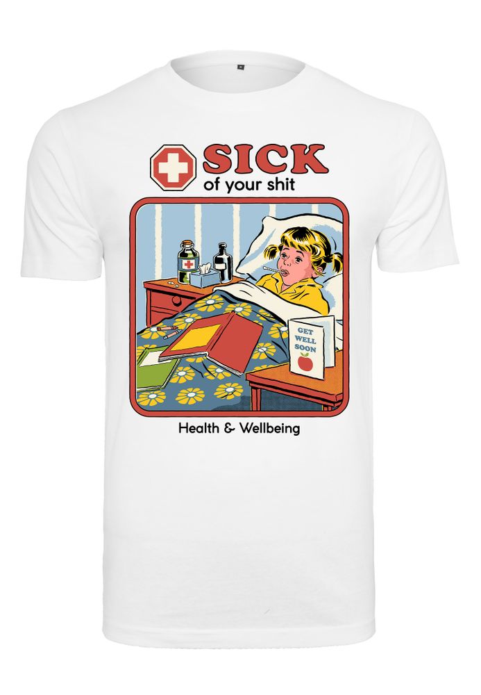 The T-shirt shows a sick girl with a thermometer in her mouth. In the background you can see some medicine. Above you can read the text "Sick of your shit".