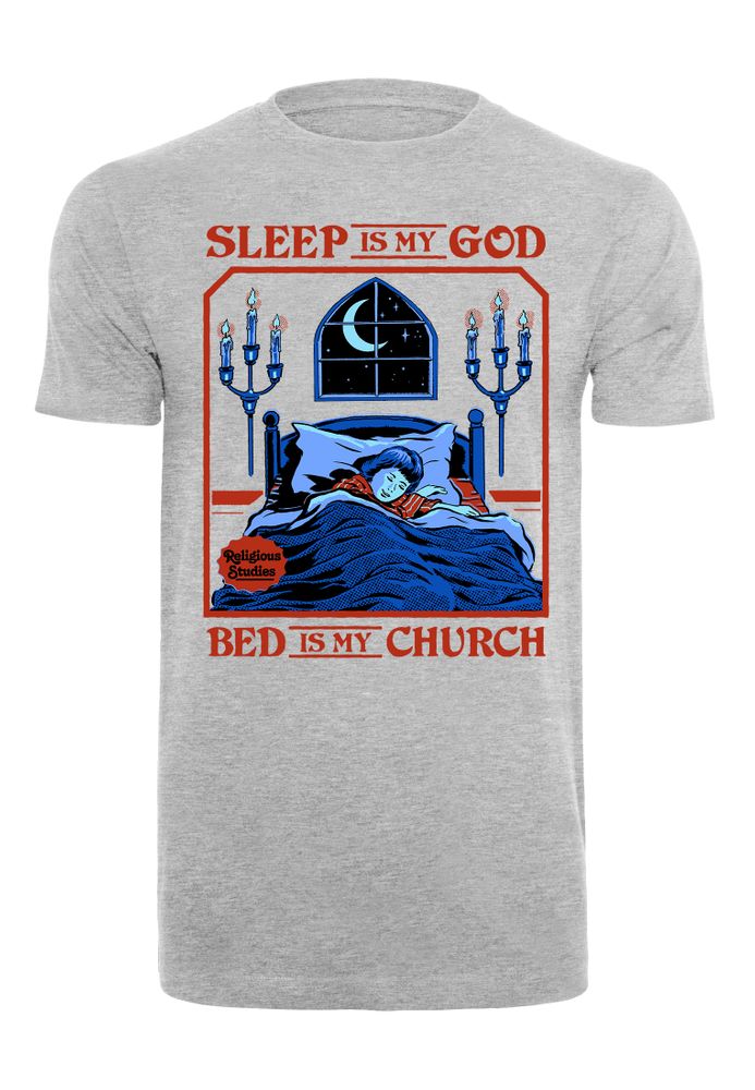 The T-shirt shows a sleeping child surrounded by two candlesticks. You can see the text "Sleep Is My God" and "Bed Is My Church".