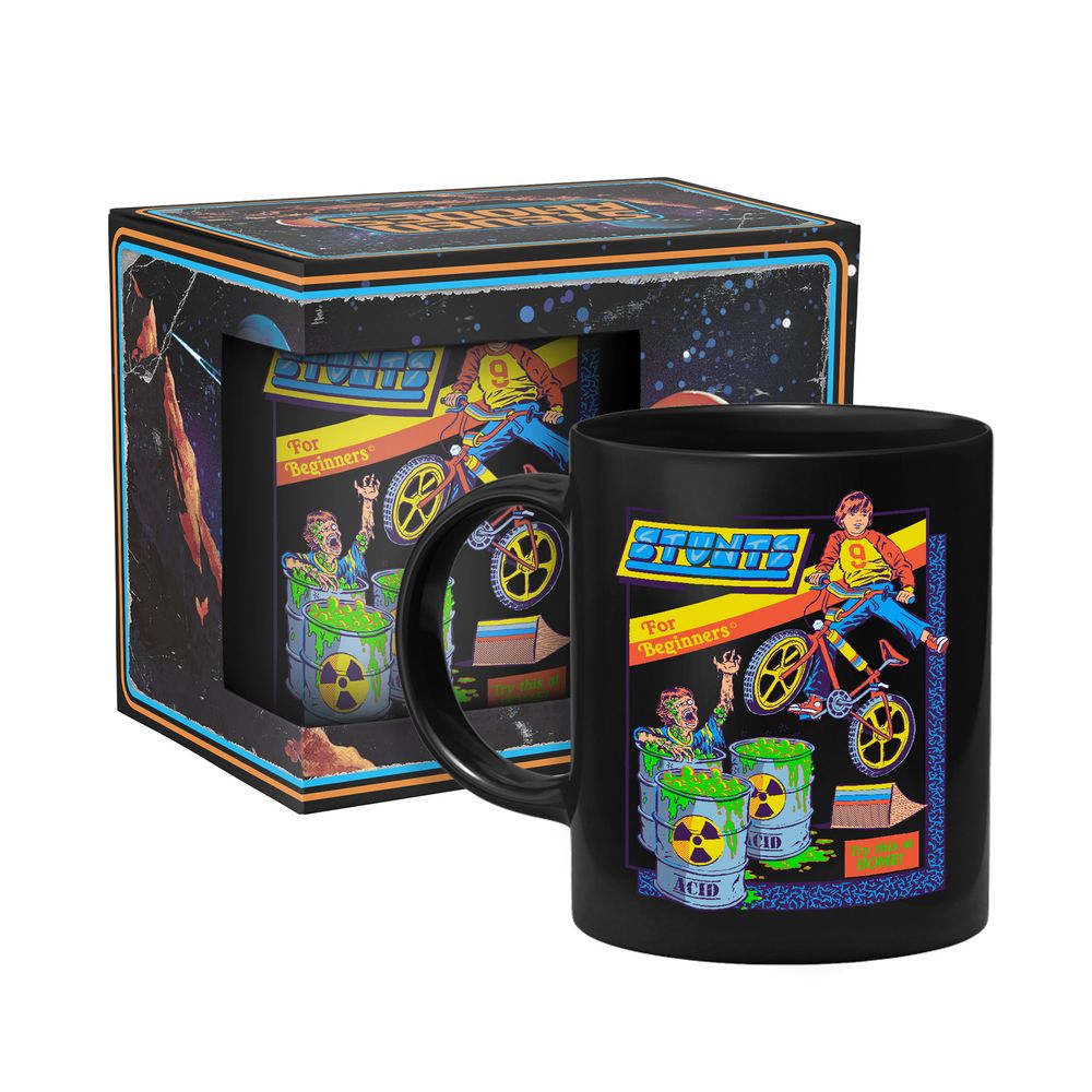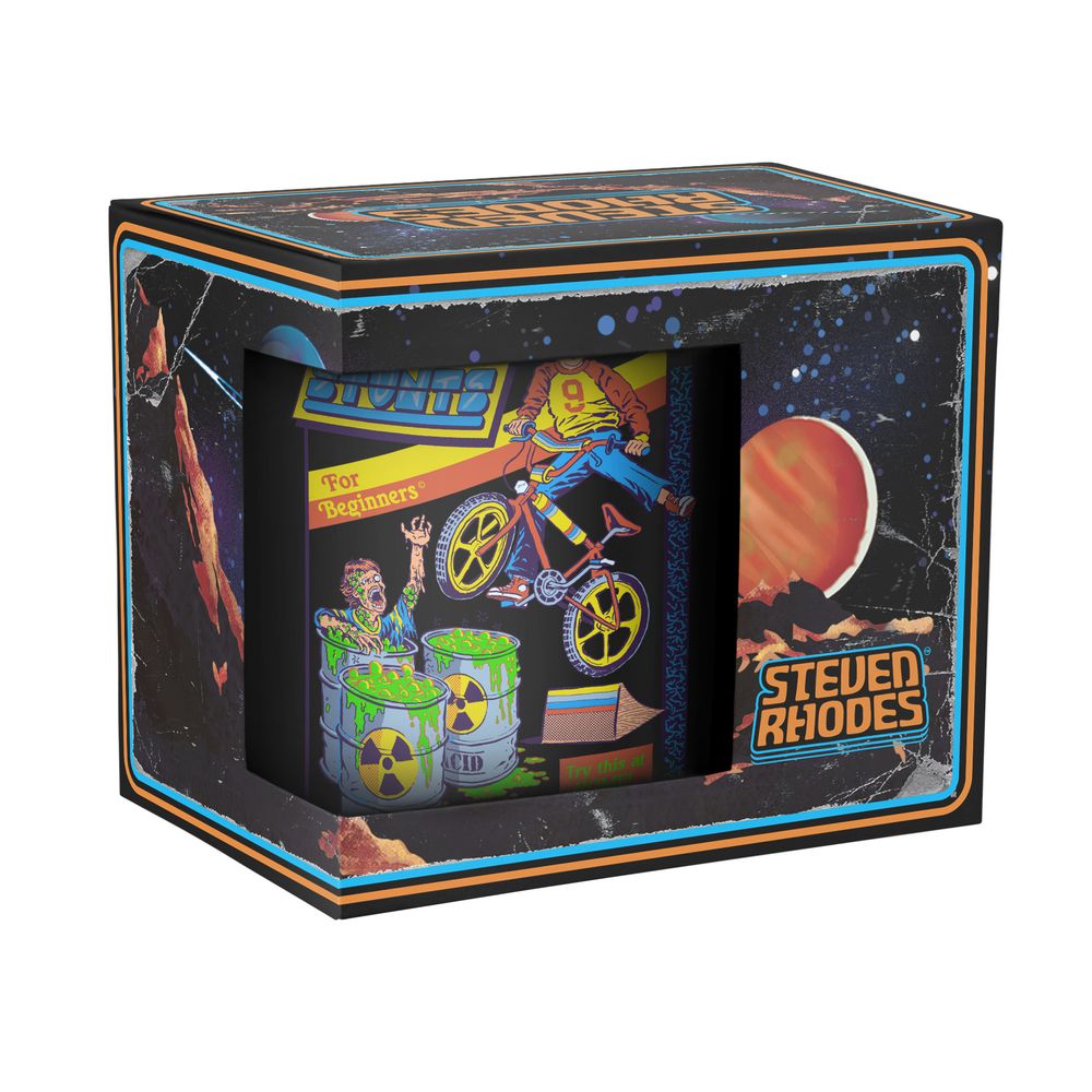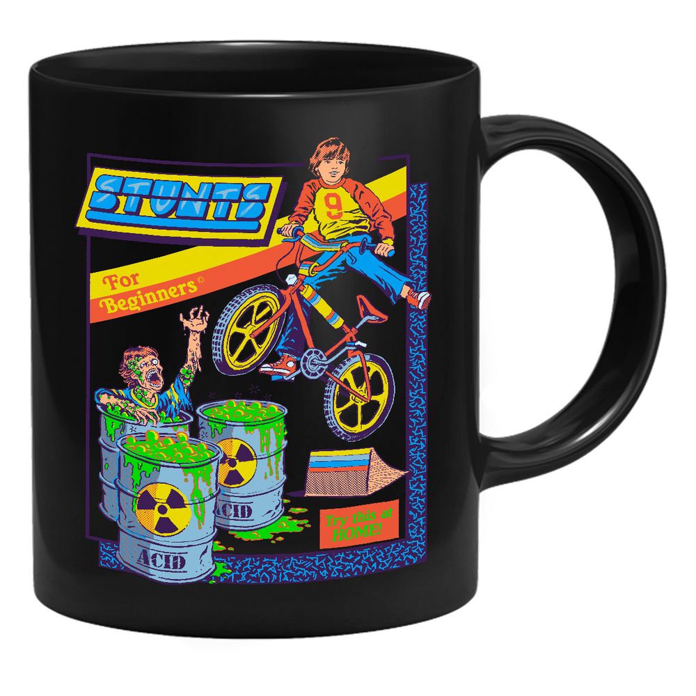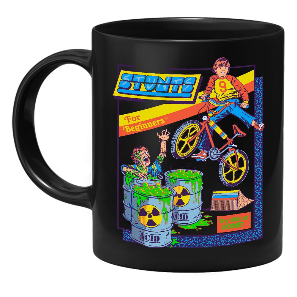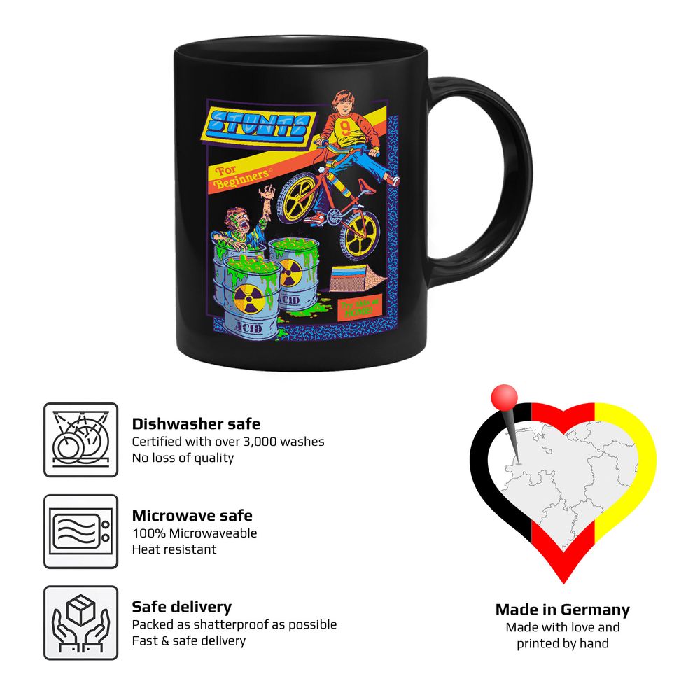 The cup shows a boy doing stunts on a bicycle. In front of him are 3 poisonous barrels. In one of them sits already another child.