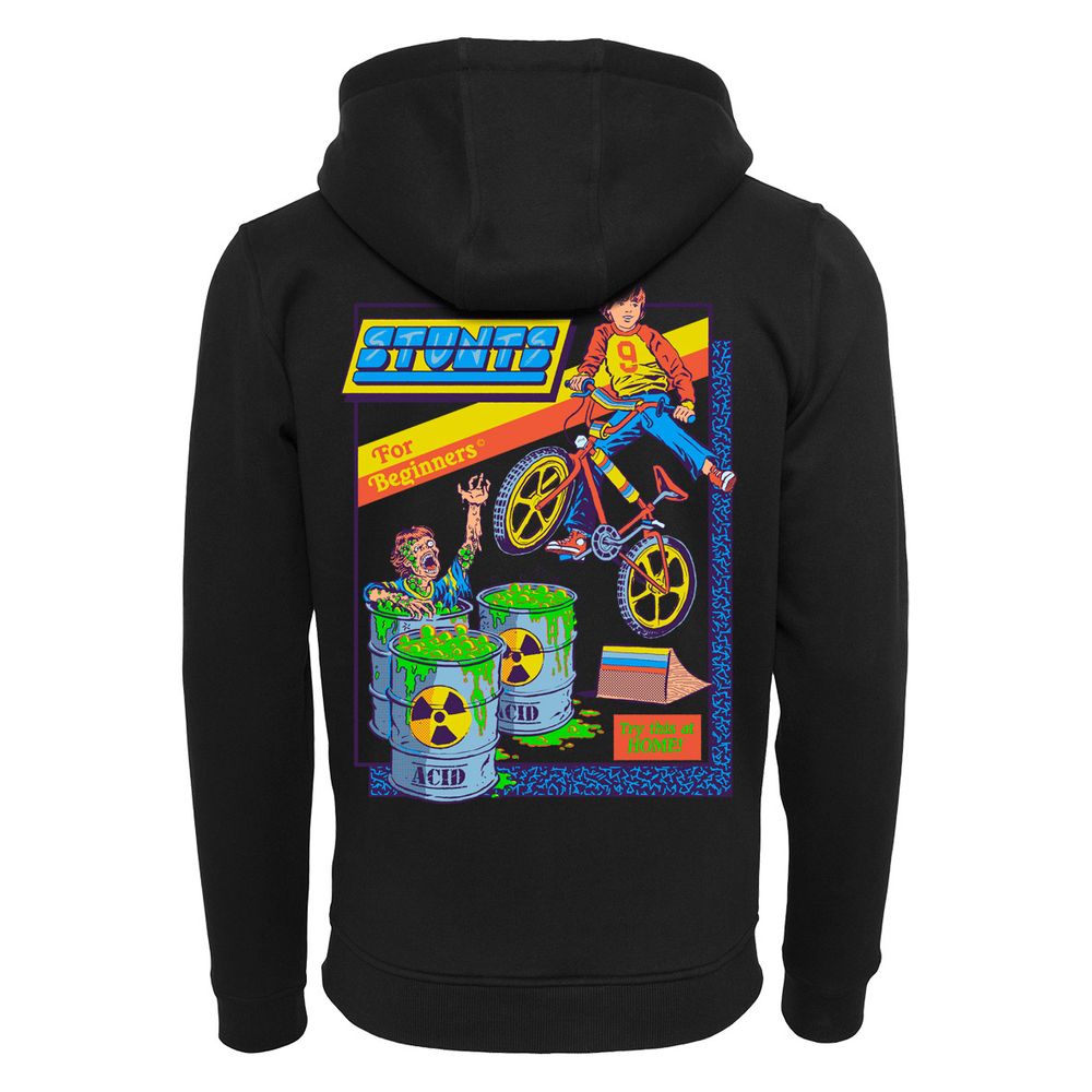 Zip hoodie shows a boy doing stunts on a bike. In front of him are 3 toxic barrels. In one of them there is already another child sitting.