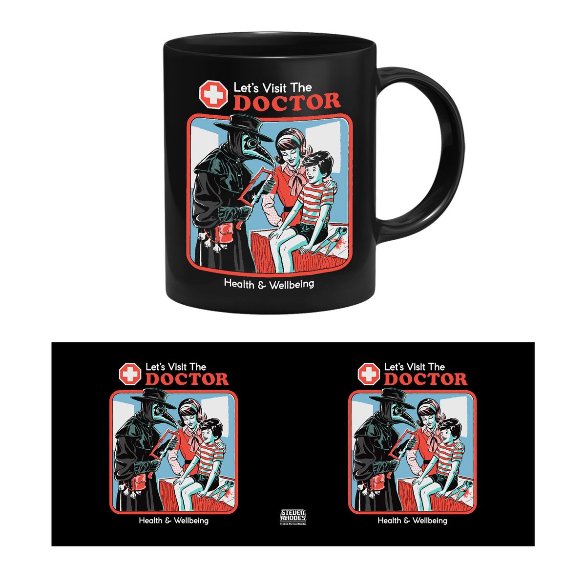 The mug shows a plague doctor standing in front of a little boy with a saw.