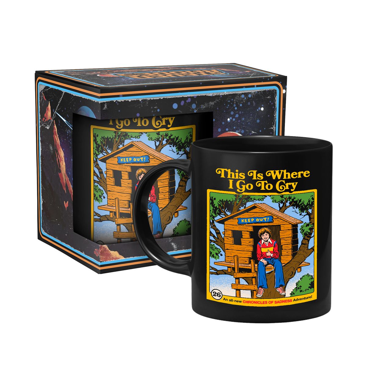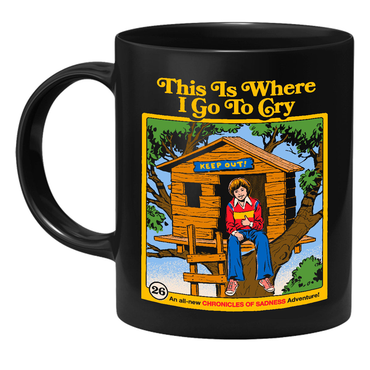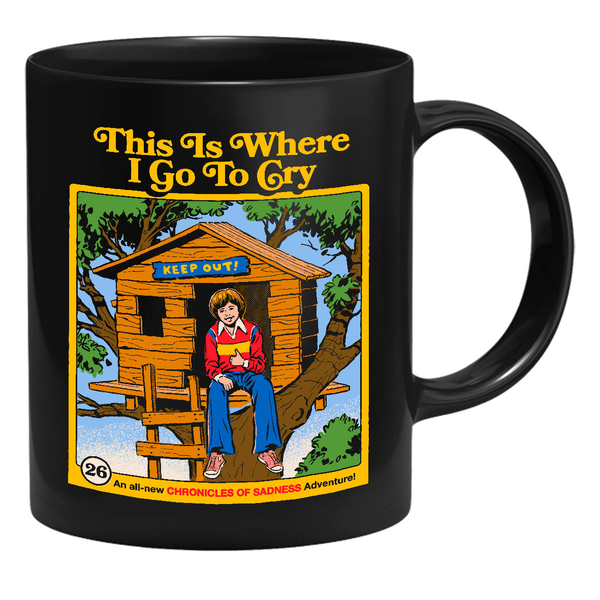 The mug shows a boy in his tree house with the slogan “This Is Where I Go To Cry”.