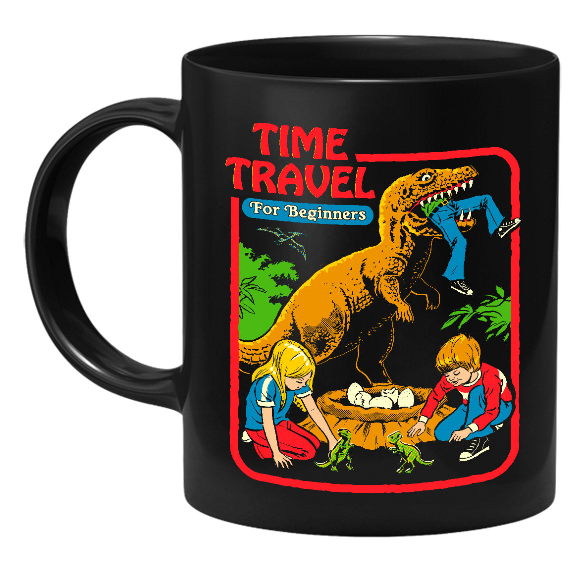 The mug shows two children playing with baby dinosaurs. In the background, a boy is being eaten by a T-Rex.