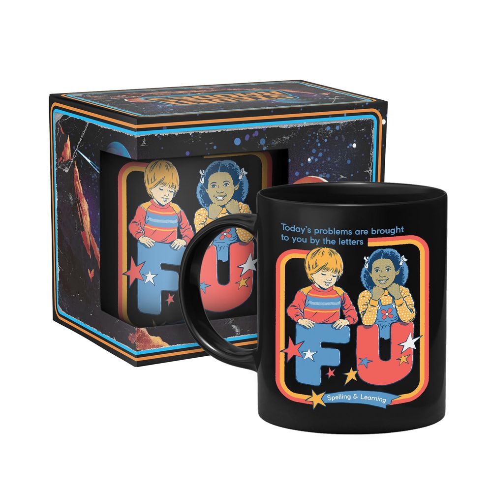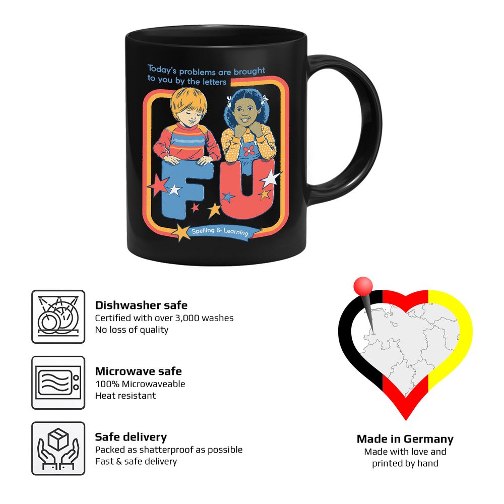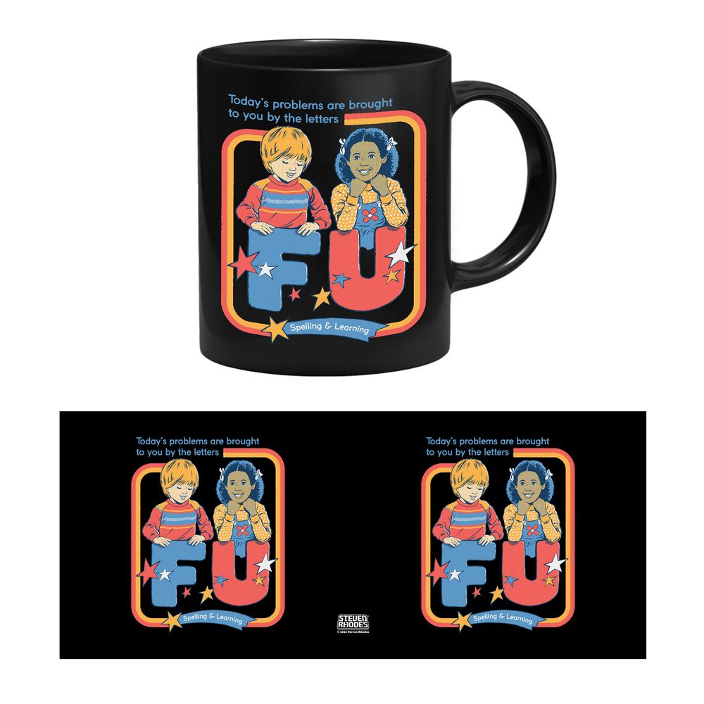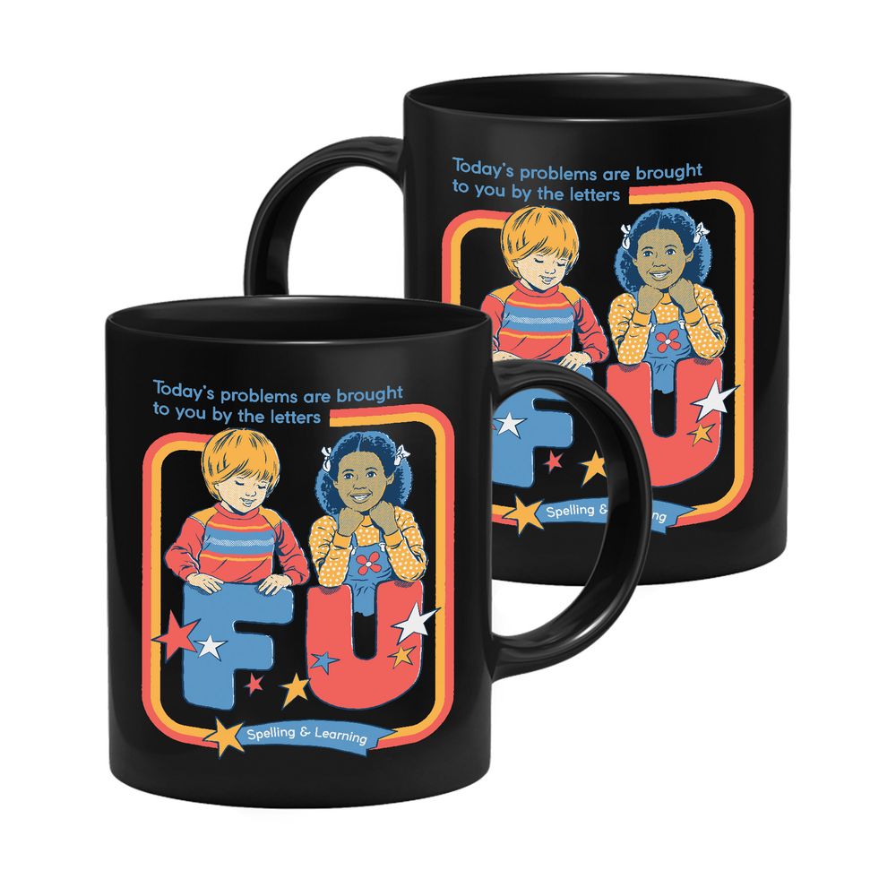The cup shows the saying "Today's problems are brought to you by the letters FU". Above the letters FU you can see 2 children.