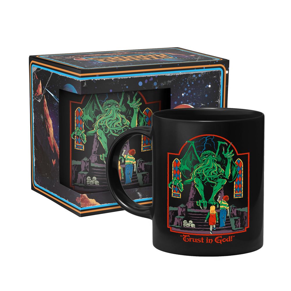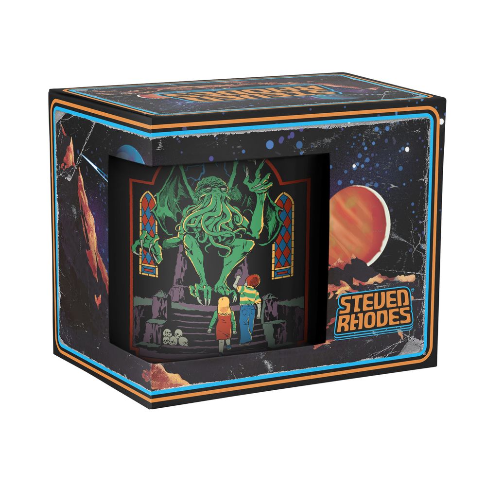 The cup shows two children standing in front of Cthulhu.