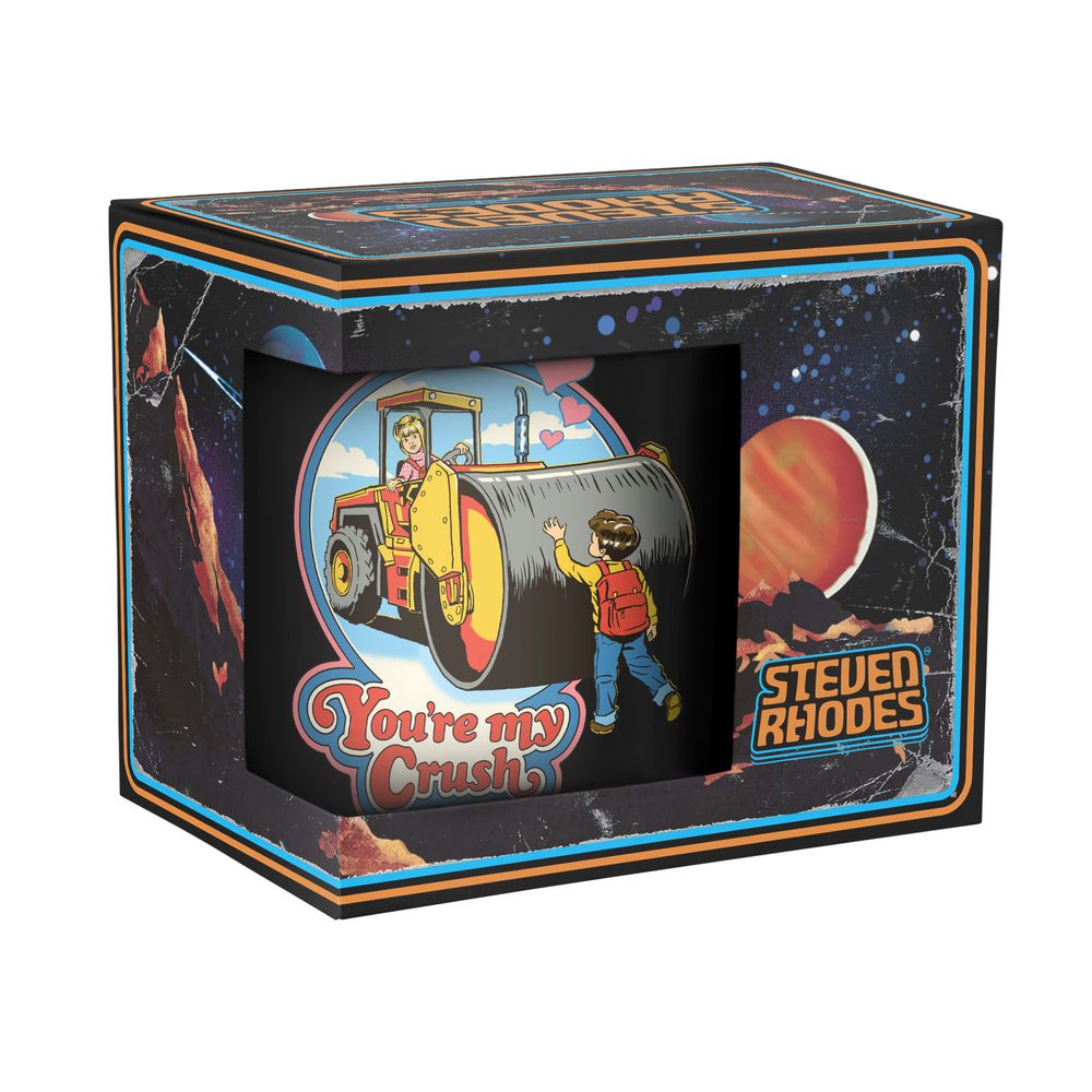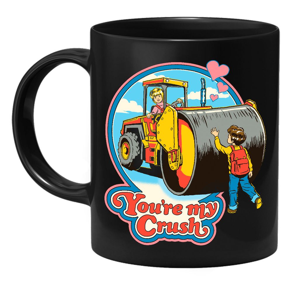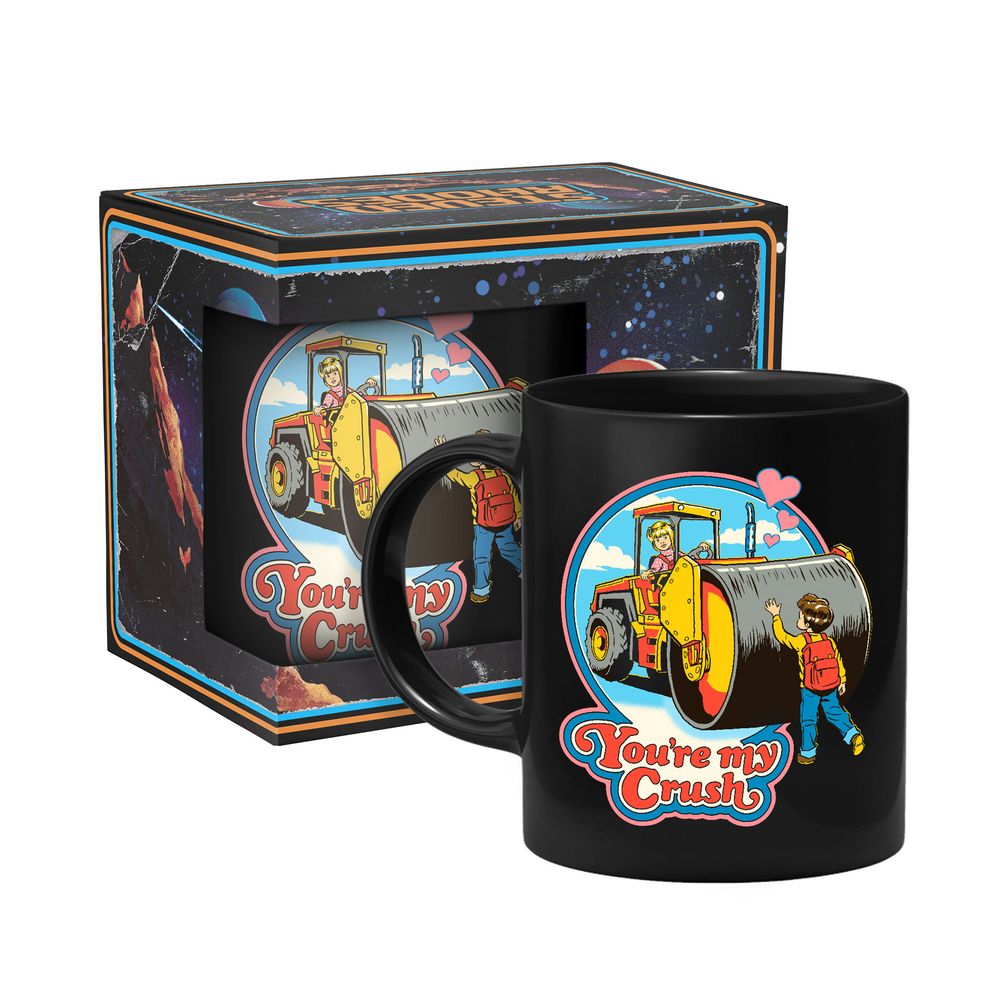 The cup shows a girl sitting on a steamroller. In front of her is a boy who waves to her.