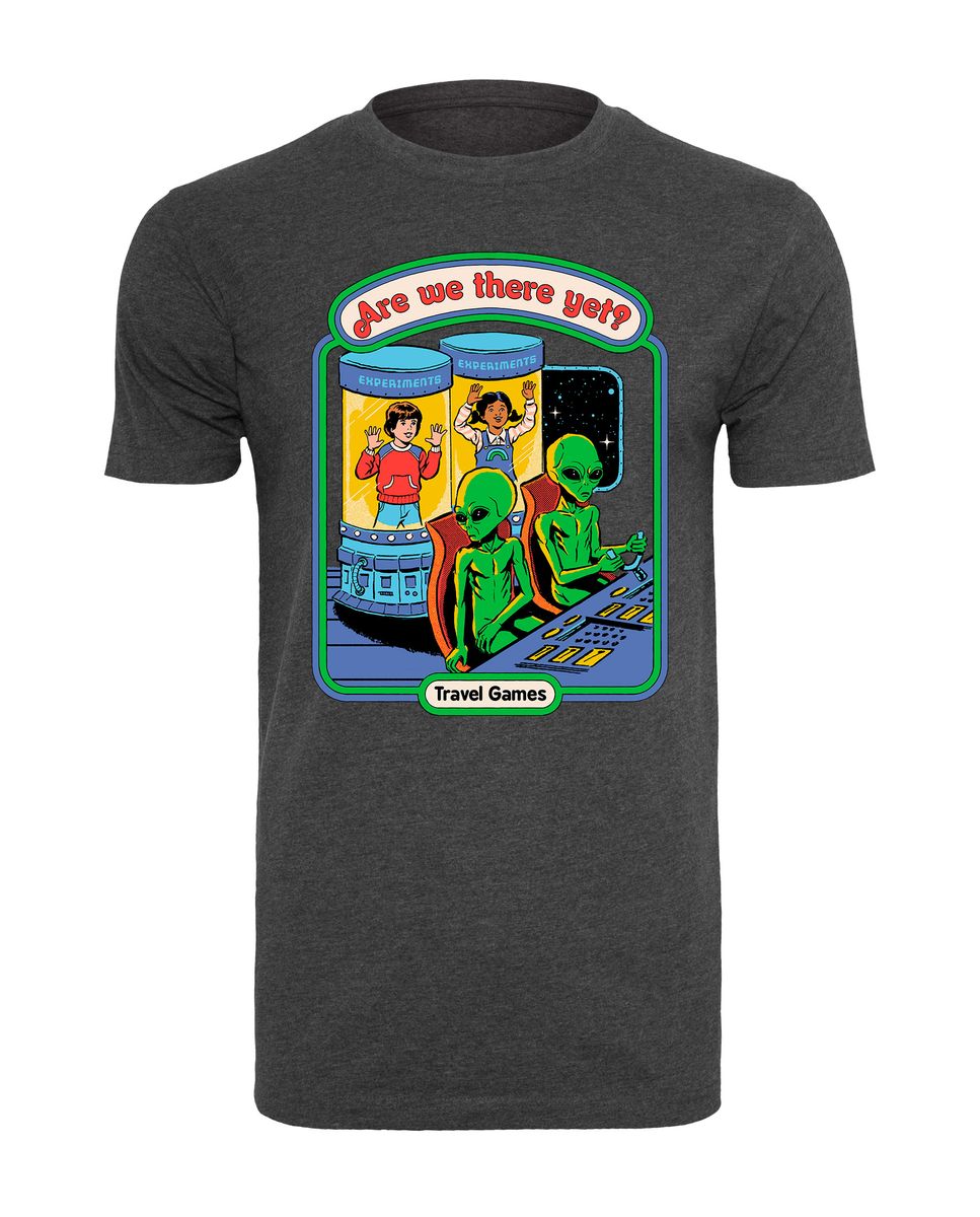 Das T-Shirt zeigt zwei Kinder, die ständig fragen, ob sie schon da sind. Allerdings wurden sie von Aliens entführt.