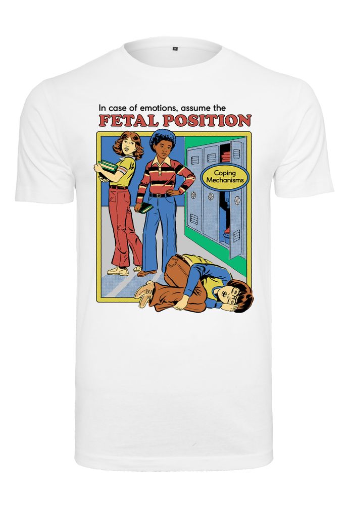 Das T-Shirt zeigt zwei Kinder, die ein Mädchen beobachten, das in Fötusstellung auf dem Boden liegt. Oben steht "In case of emotions, assume the Fetal Position".