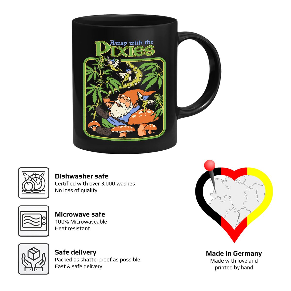 Die Tasse zeigt einen Zwerg umgeben von kleinen Feen und besonderem Gras.