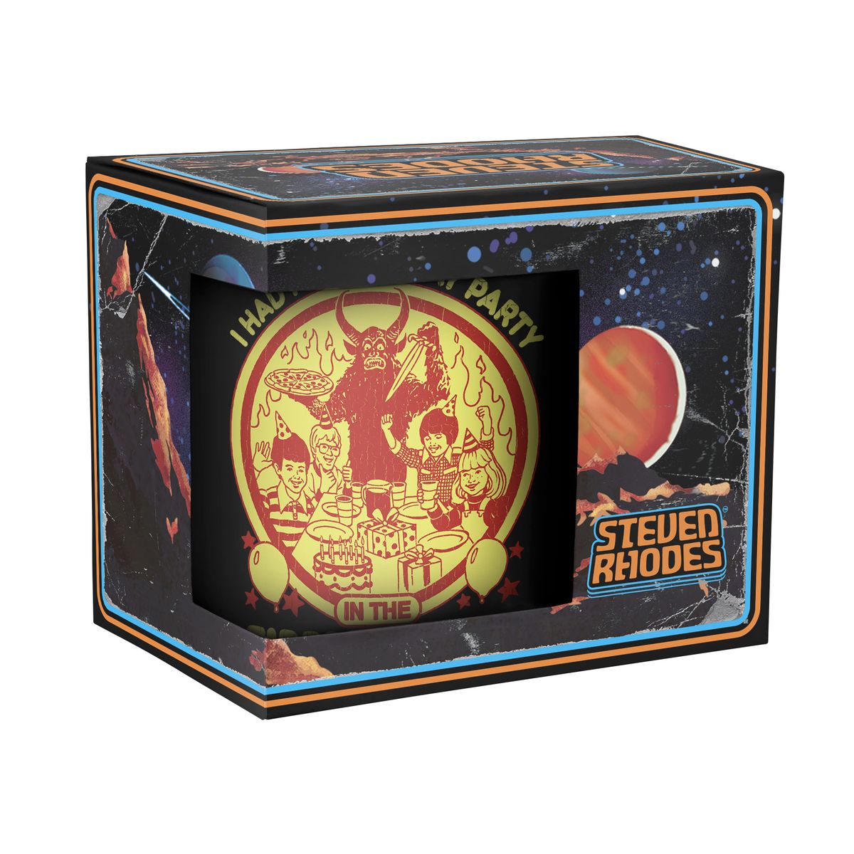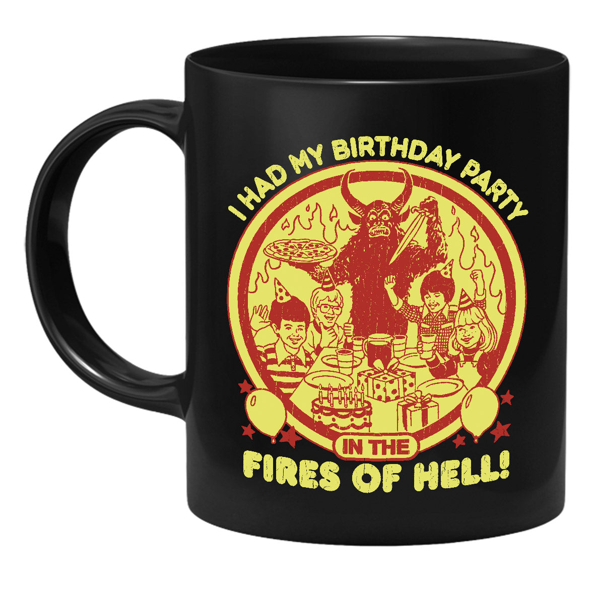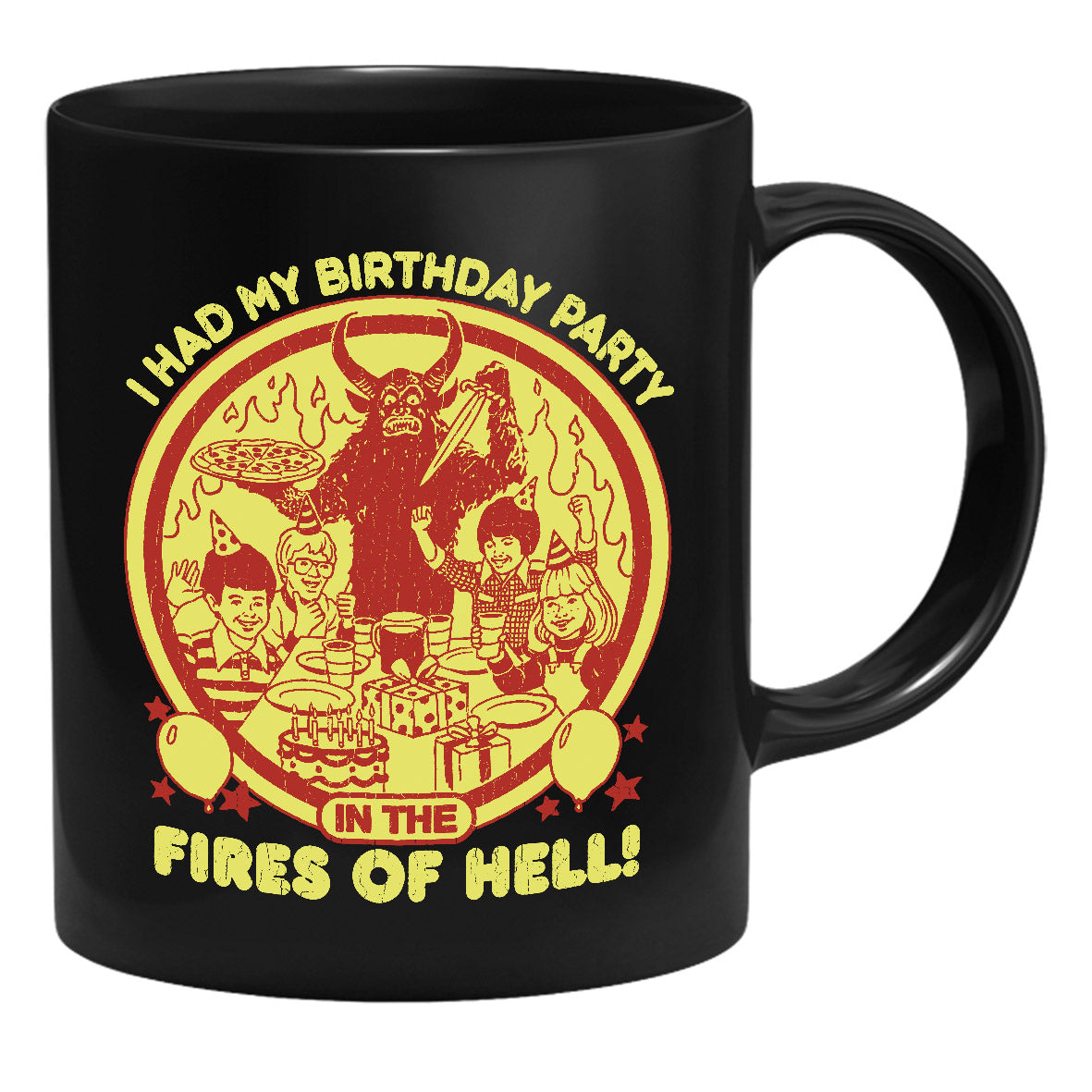 Die Tasse zeigt einen Kindergeburtstag mit dem Teufel als Kellner.