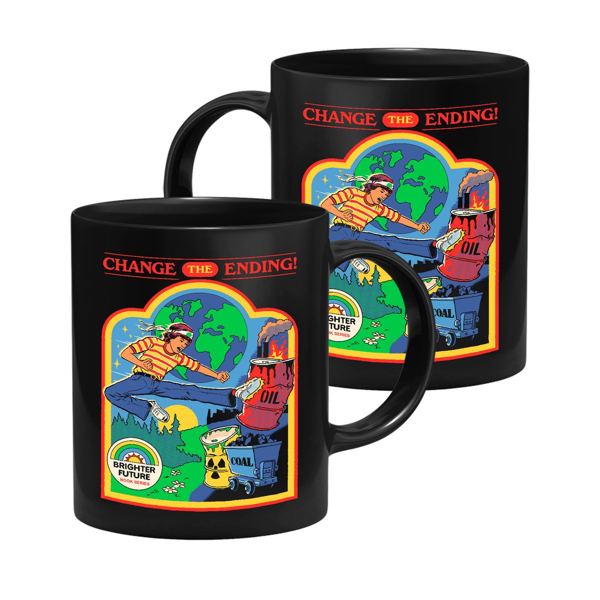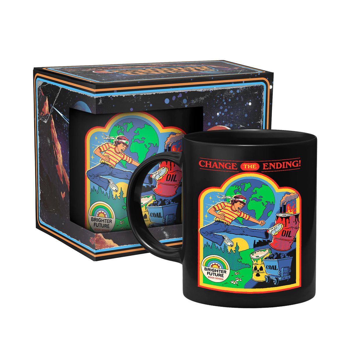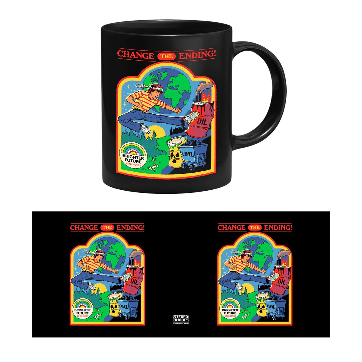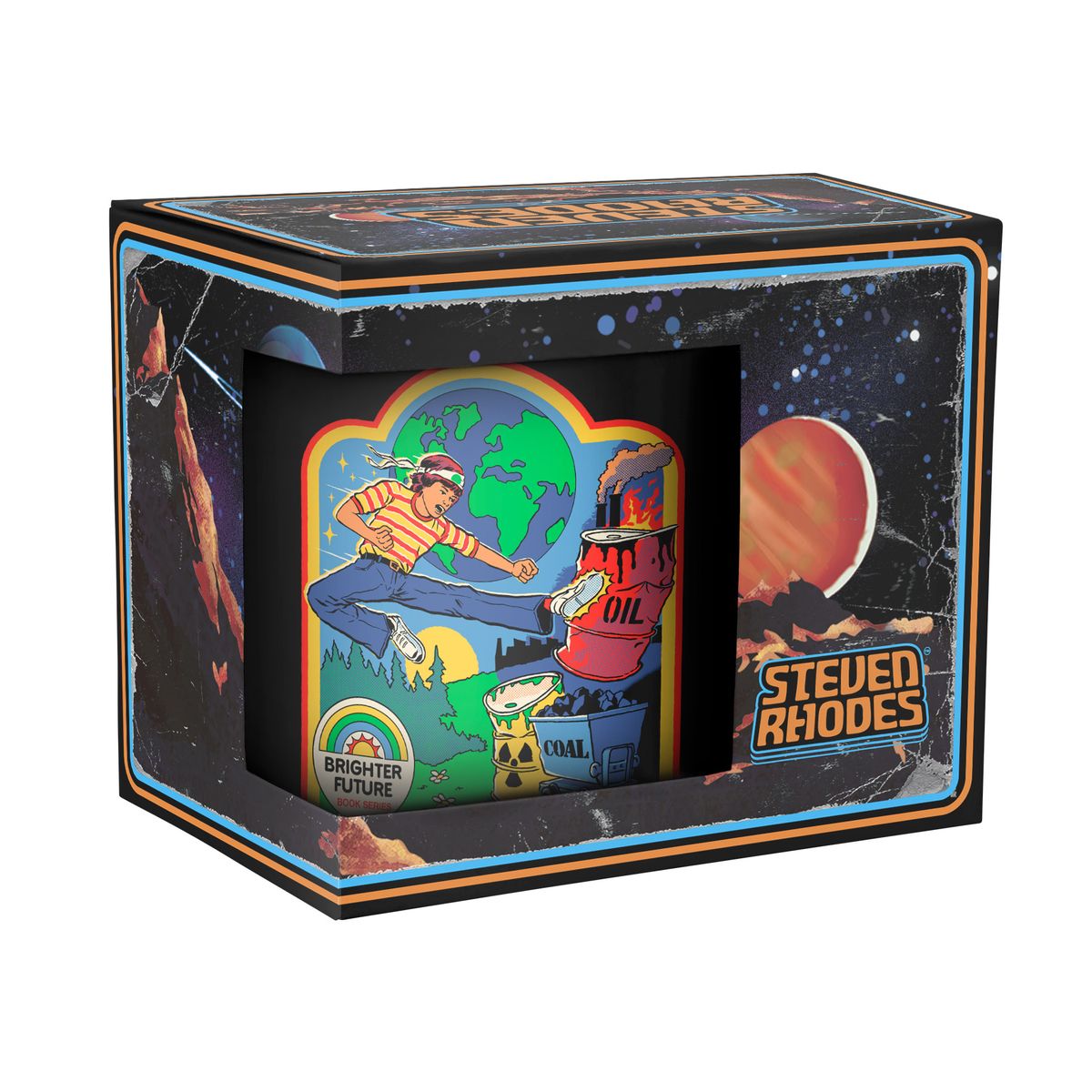 Die Tasse zeigt einen Jungen, der gegen eine Öltonne tritt.
