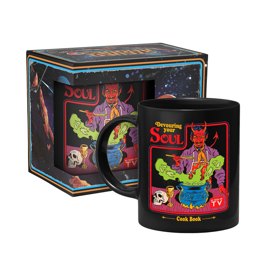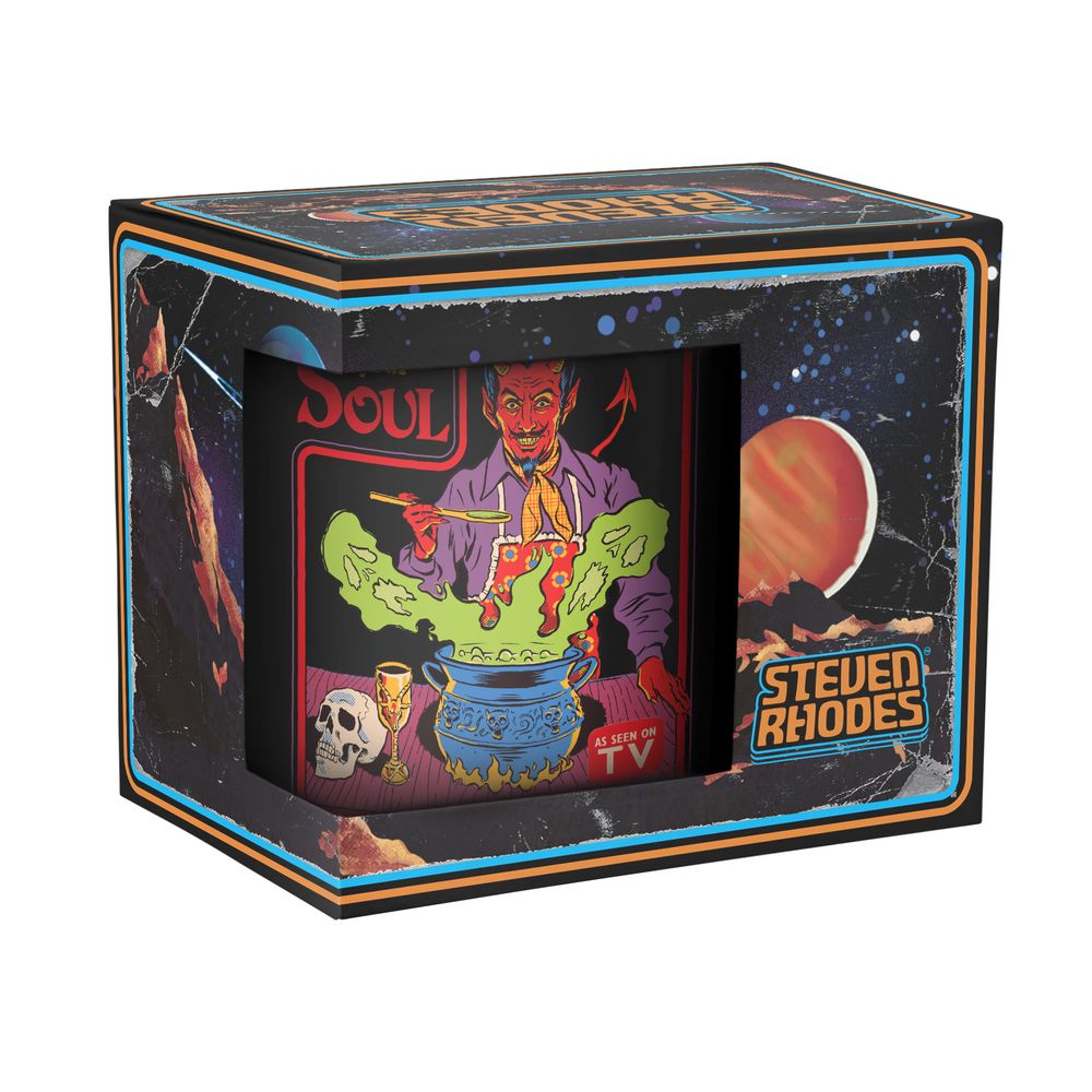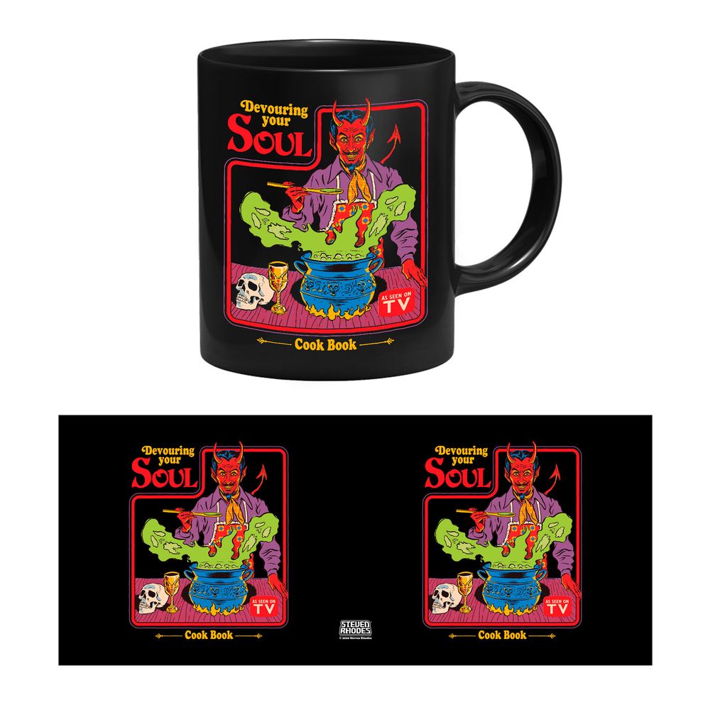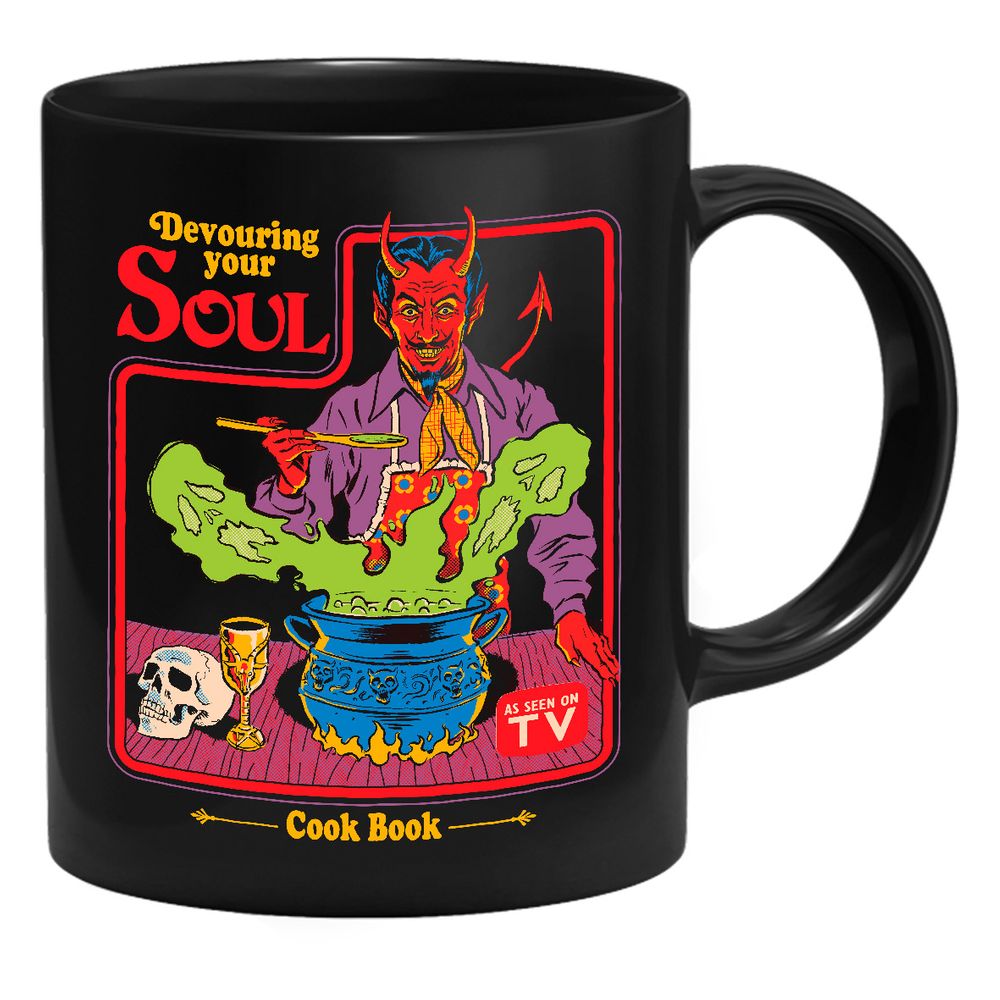 Die Tasse zeigt den Teufel, der eine Suppe kocht.