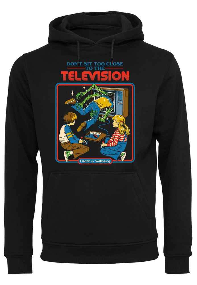 Der Hoodie zeigt ein Kind, das in den Fernseher gezogen wird.