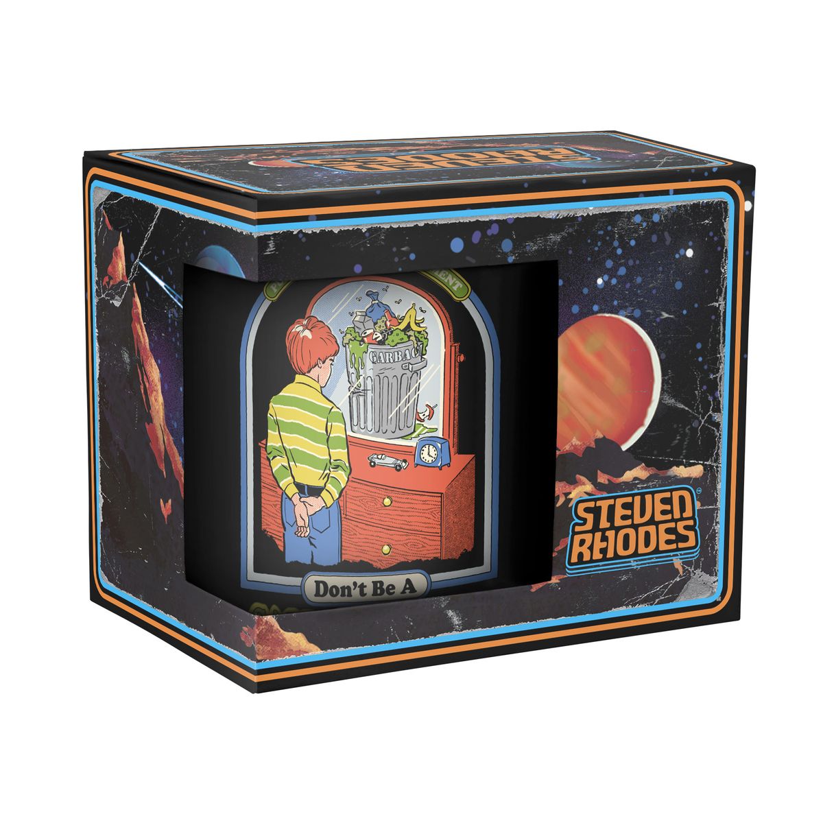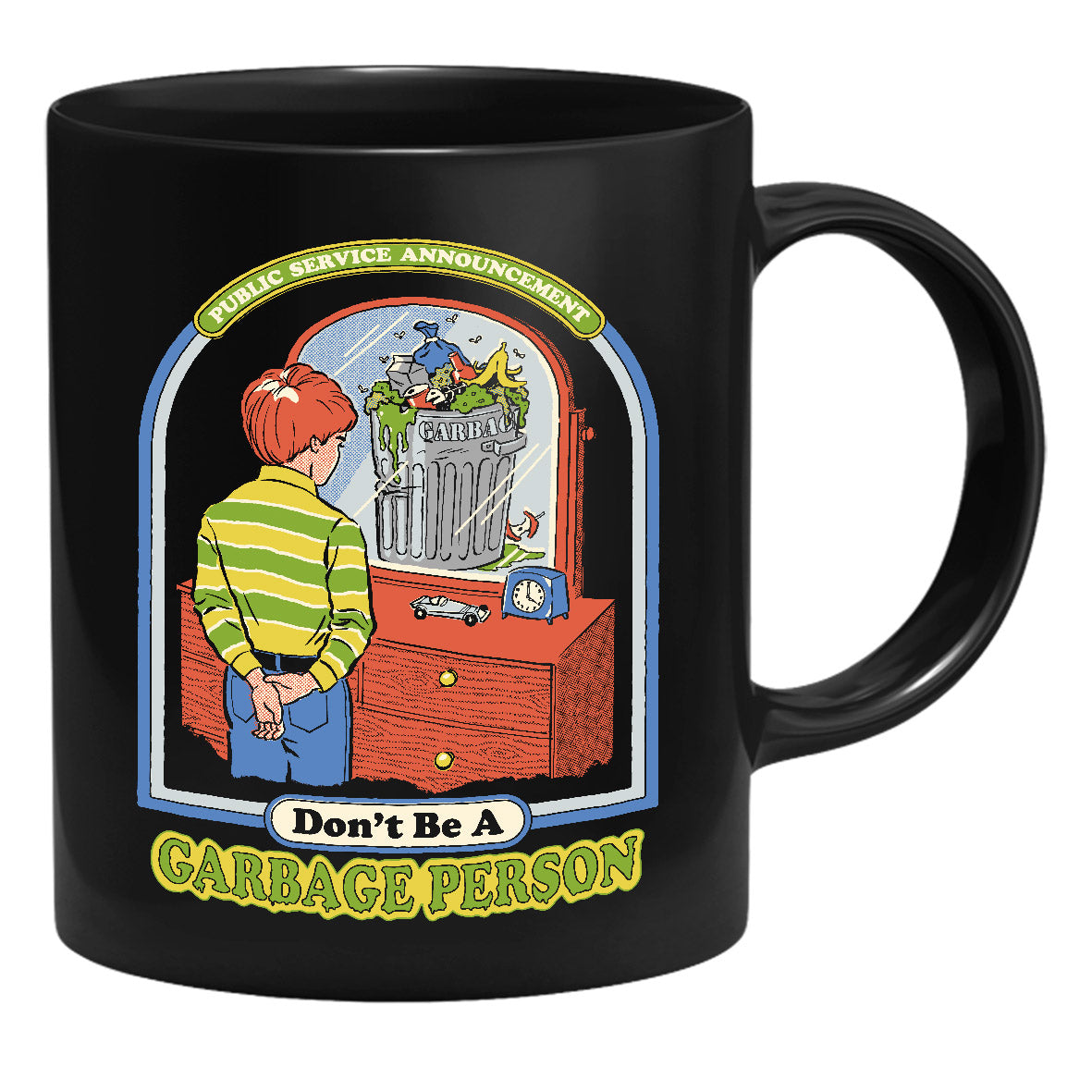 Die Tasse zeigt einen Jungen, der im Spiegel eine volle Mülltonne sieht. Dazu steht geschrieben "Don't Be A Garbage Person".