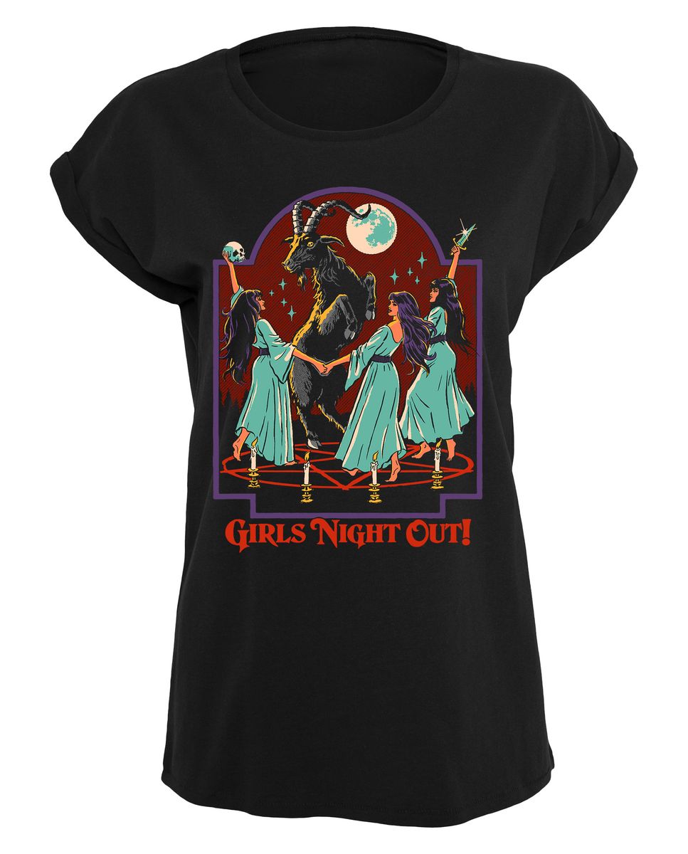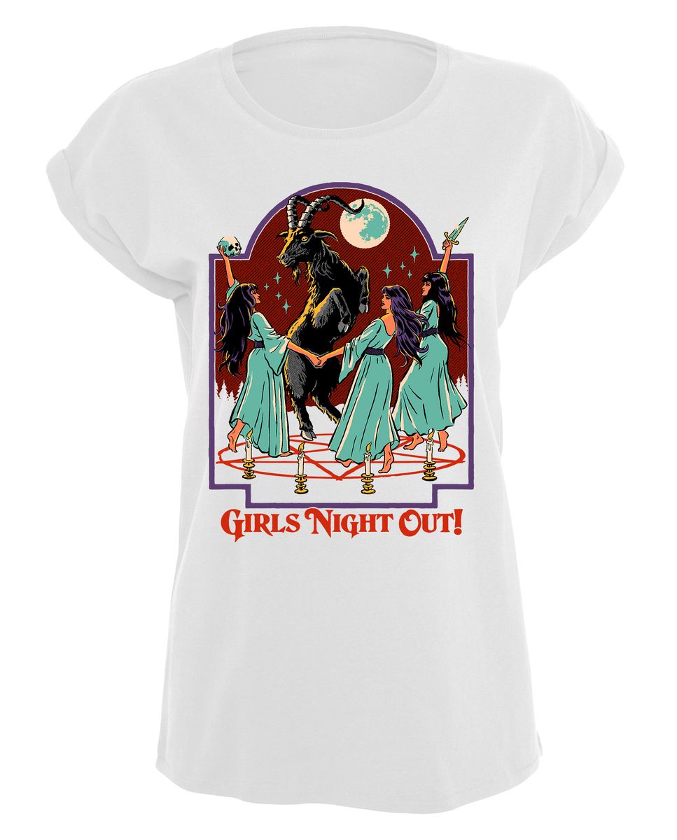 Das T-Shirt zeigt drei Frauen, die um einen Ziegenbock tanzen.