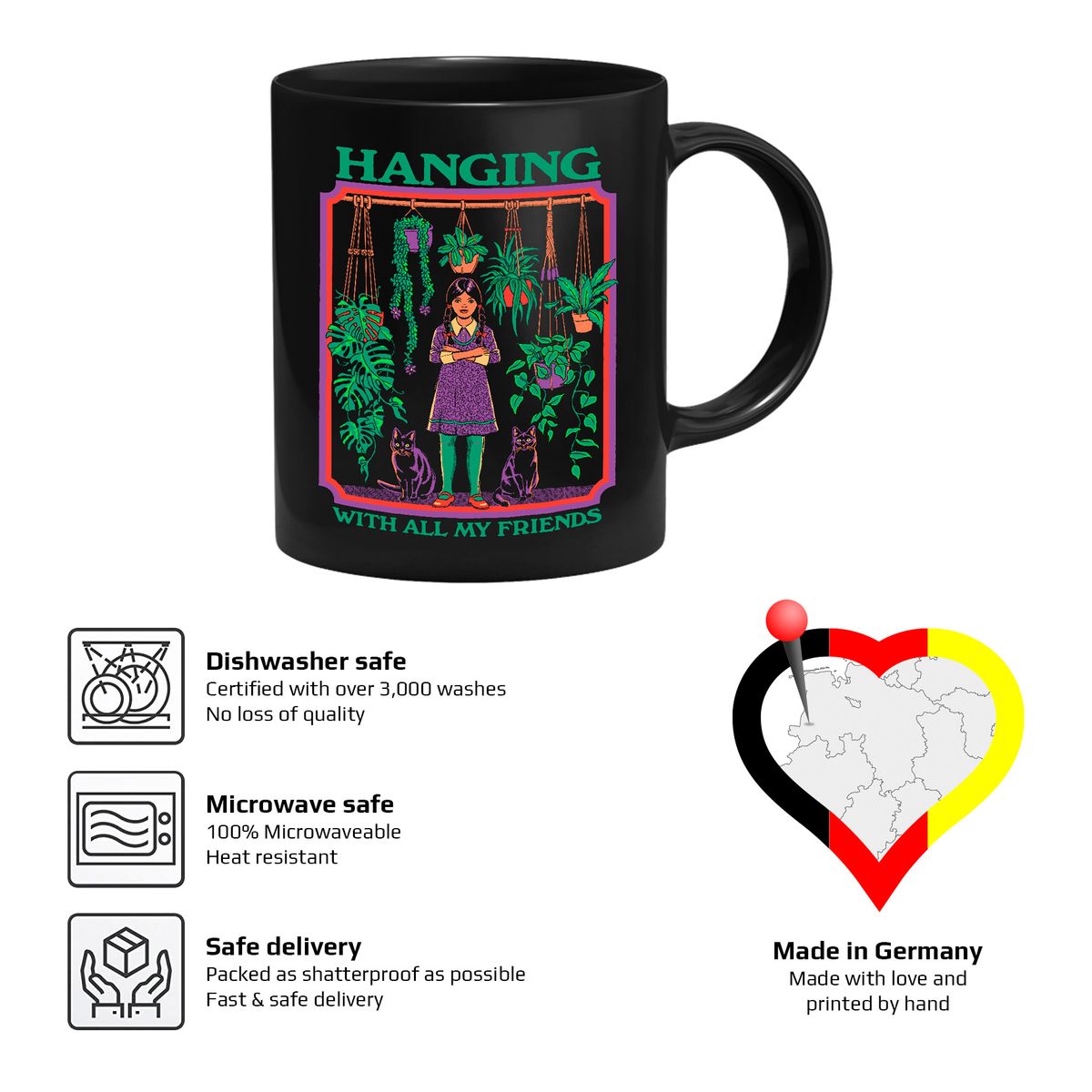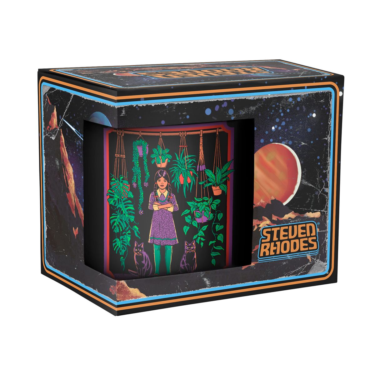 Die Tasse zeigt ein Mädchen mit ihren zwei Katzen und mehreren Hängepflanzen.