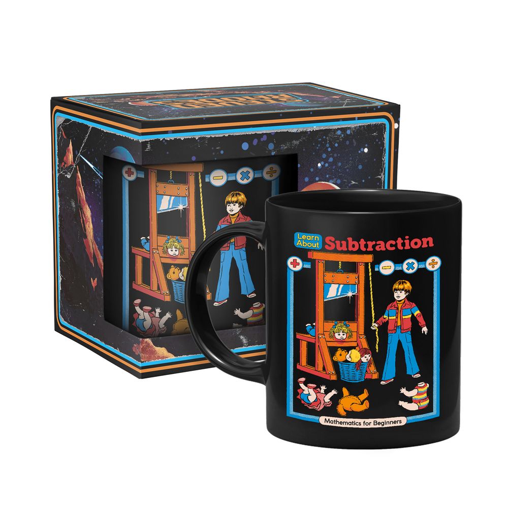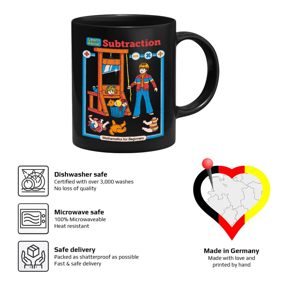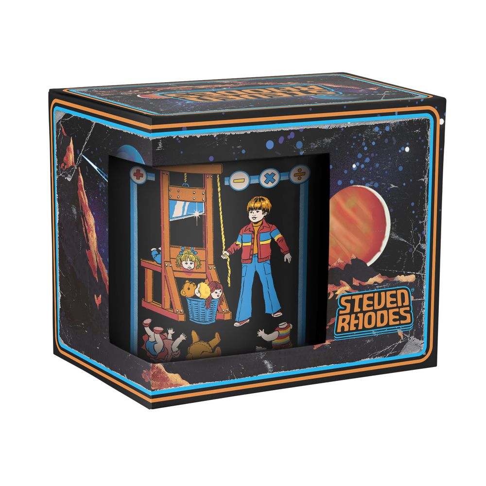 Die Tasse zeigt einen Jungen, der mit einer Guillotine spielt.