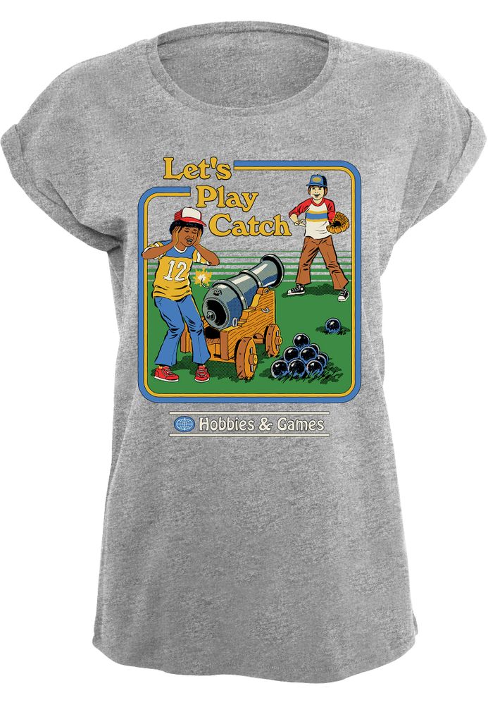 Das Girlshirt zeigt zwei Jungs, die mit Kanonenkugeln Baseball spielen, wobei ein Junge die Kugel fangen soll. Oben steht der Text "Let’s Play Catch".