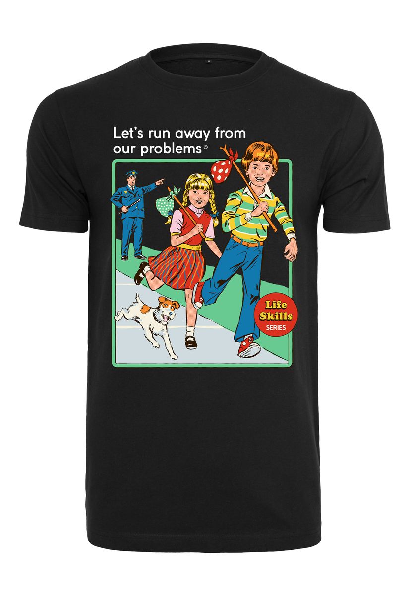 Das T-Shirt zeigt einen Jungen und ein Mädchen, die mit einem Hund vor einem Polizisten weglaufen. Außerdem liest man den Text "Let’s Run Away From Our Problems".