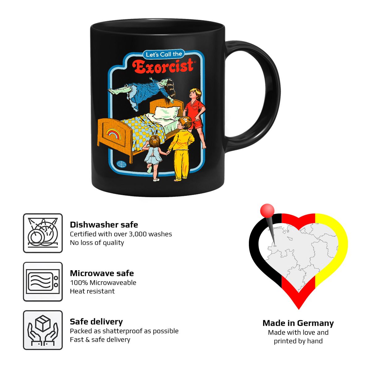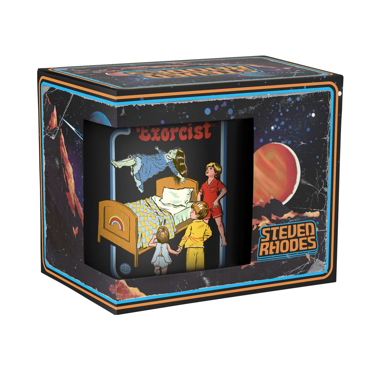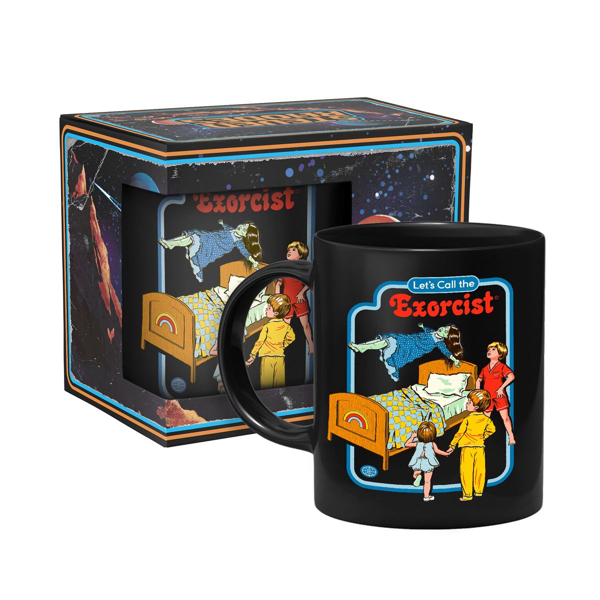 Die Tasse zeigt drei Kinder, die um das Bett eines Mädchen stehen, welches von einem Dämon besessen ist.