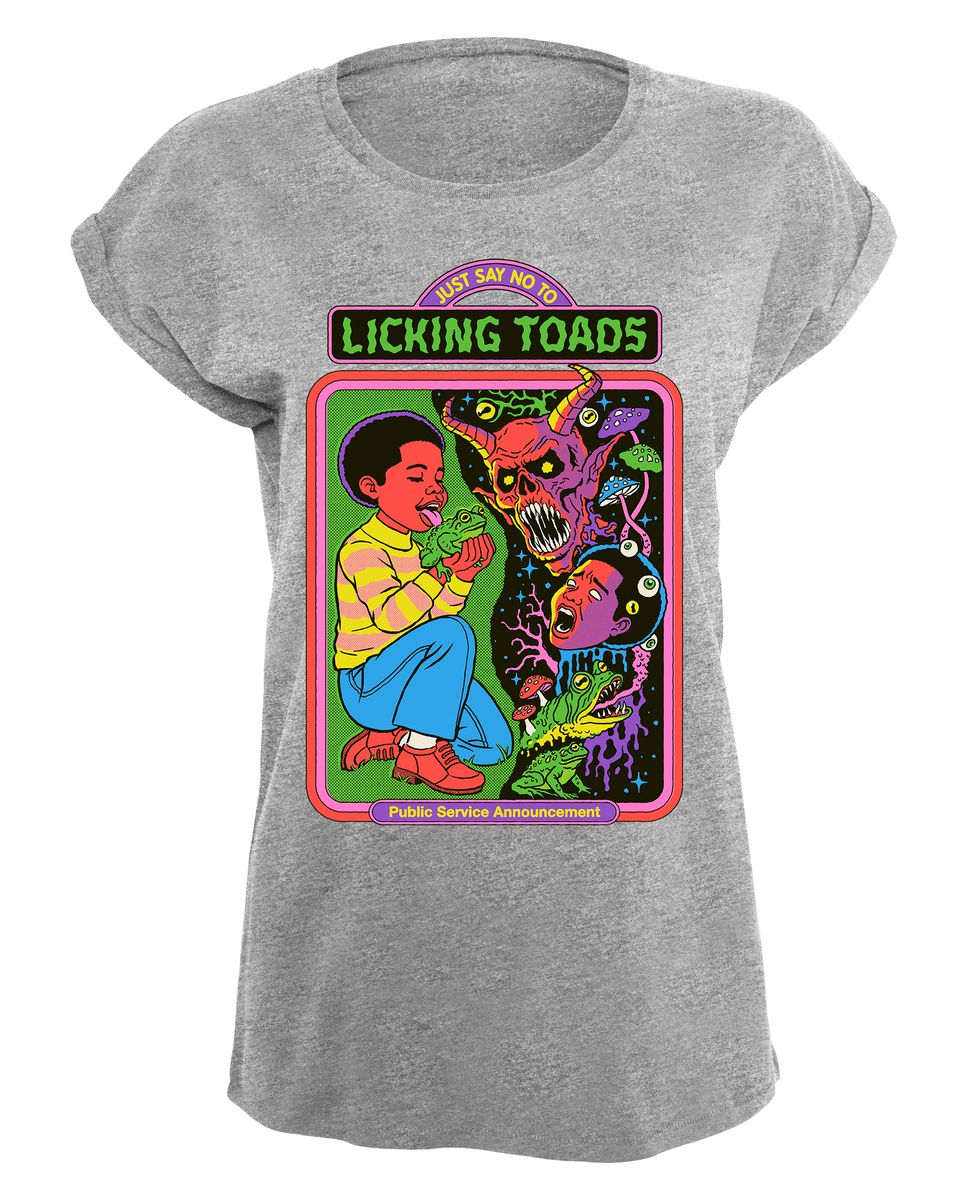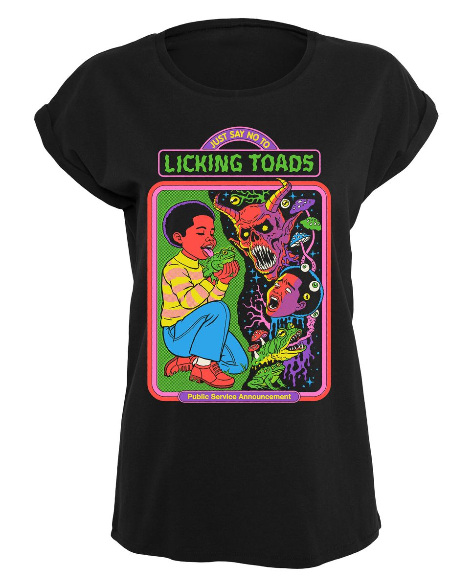 Das T-Shirt zeigt einen Jungen, der an einer Kröte leckt.