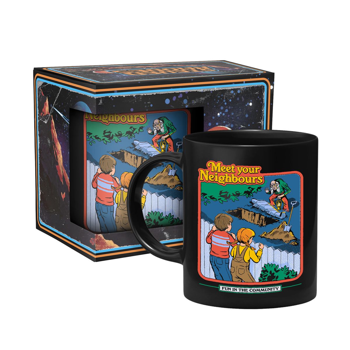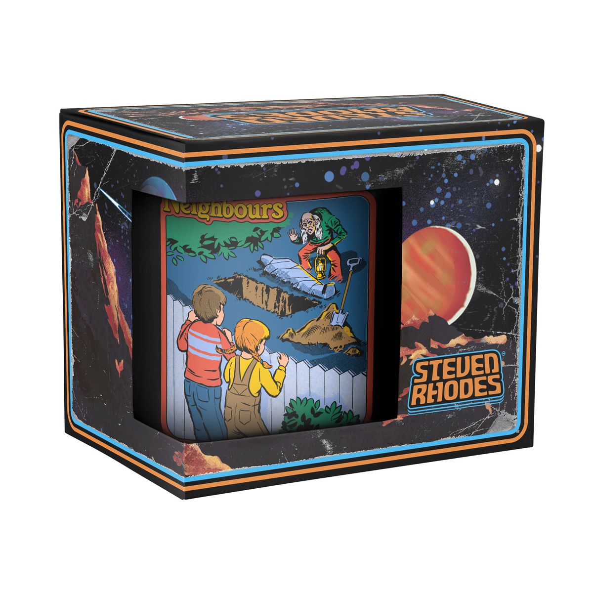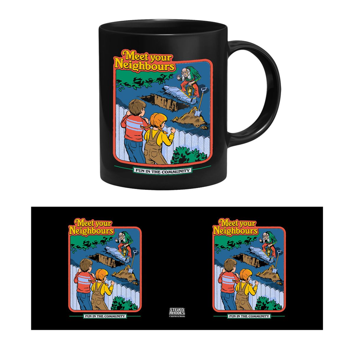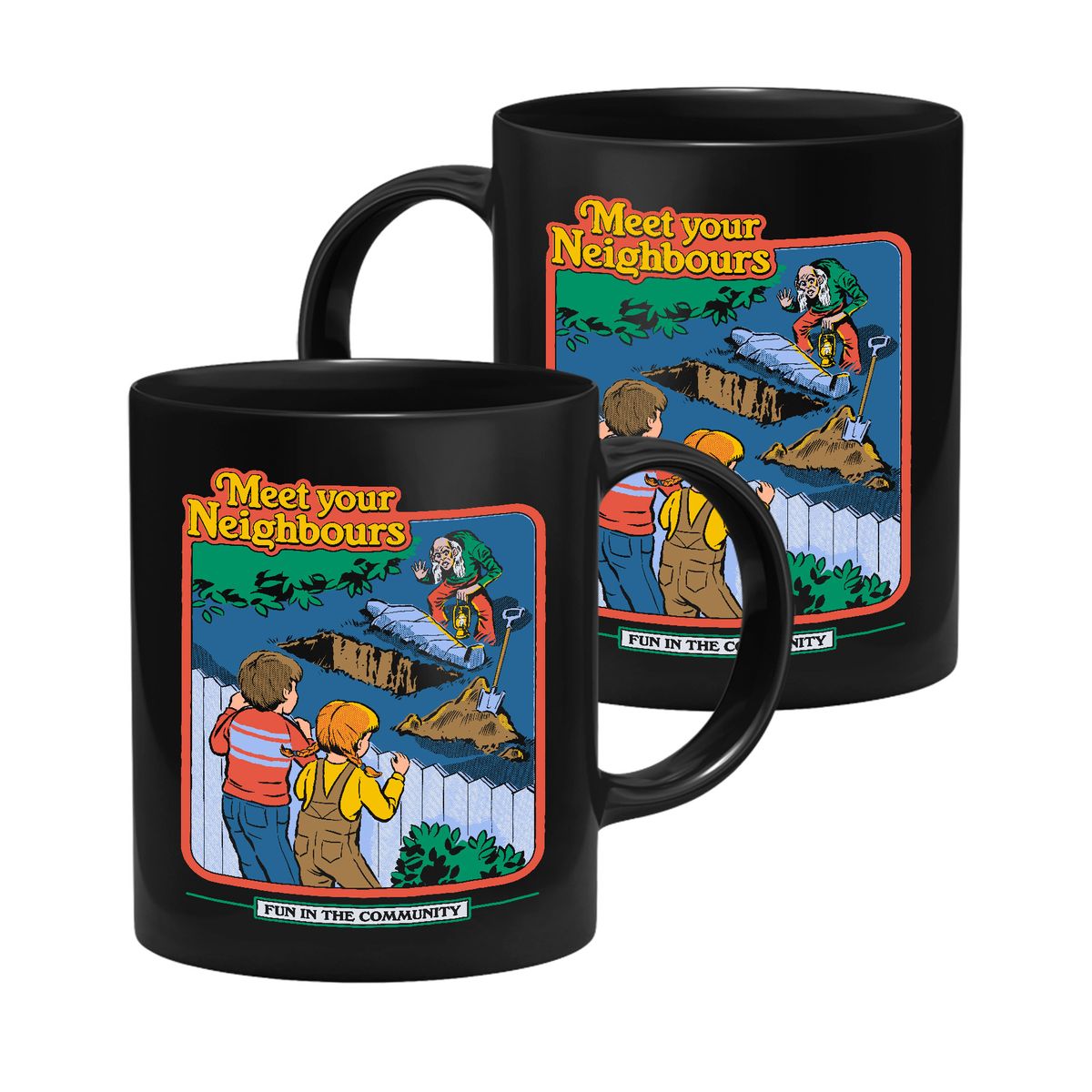 Die Tasse zeigt zwei Kinder, die ihren Nachbarn beim Ausbuddeln eines Grabs beobachten.