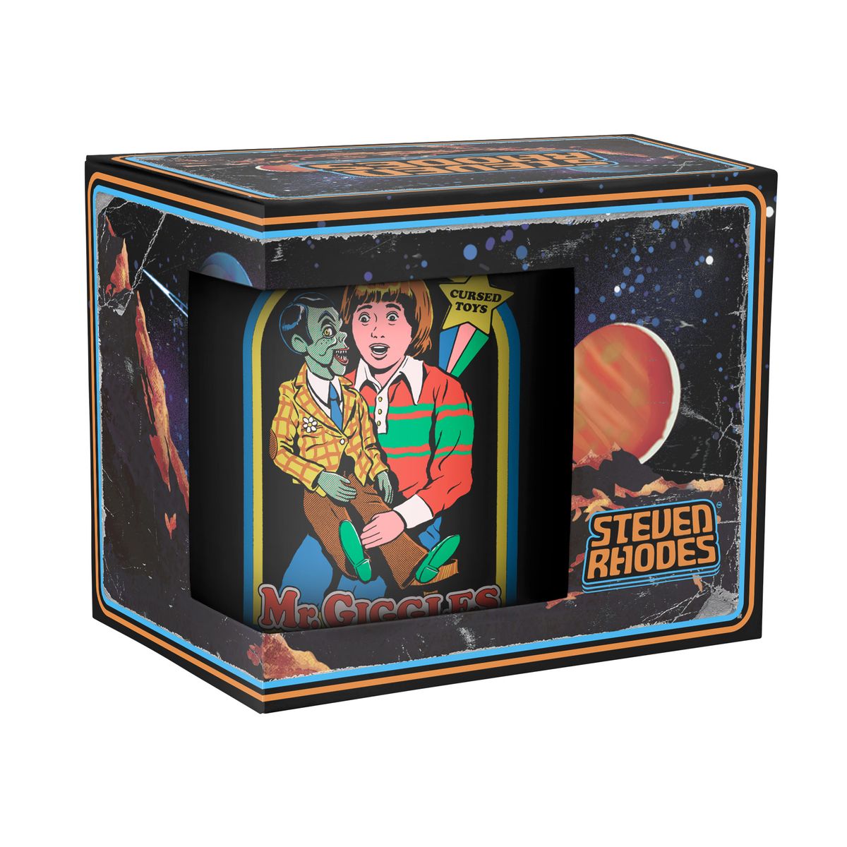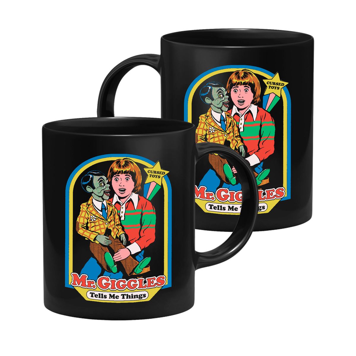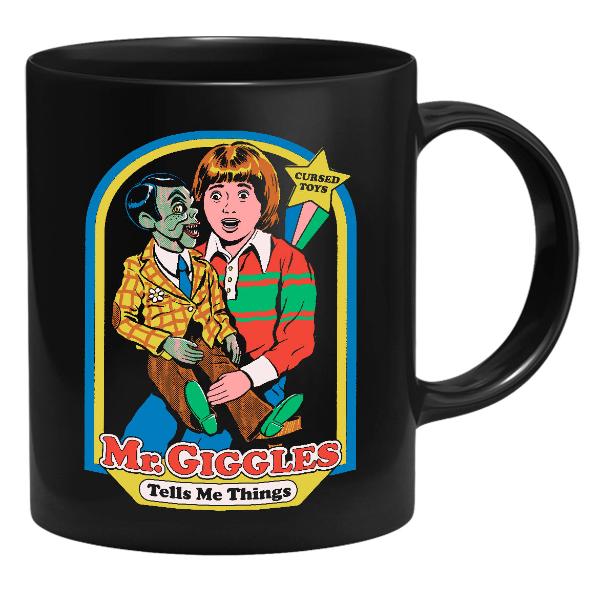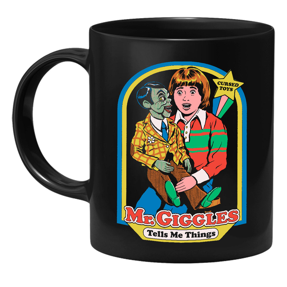 Die Tasse zeigt einen Jungen mit seiner Bauchrednerpuppe.